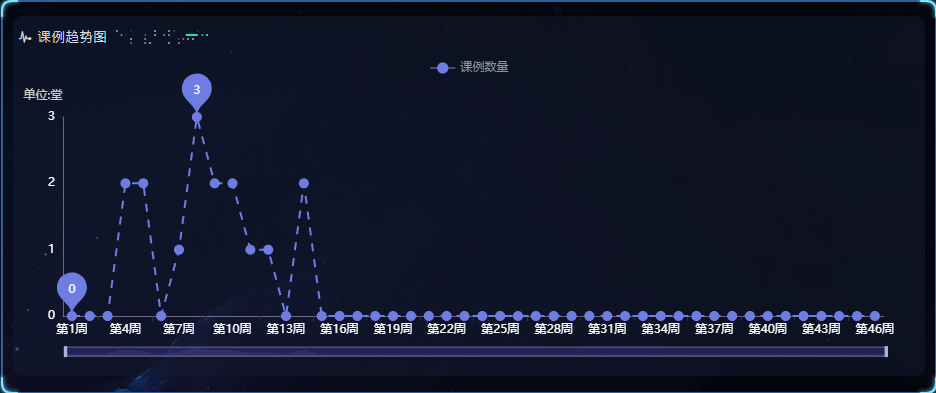 課例趨勢圖:數(shù)量趨勢方面,則會已周為單位顯示一定時間范圍內(nèi)的課例采集數(shù)量變化,判斷每學(xué)期智慧課堂使用熱門時間。
