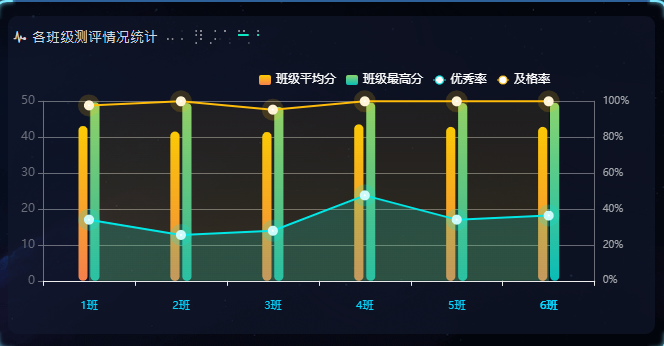 通過班級成績情況統(tǒng)計掌握學(xué)校評測結(jié)果,從平均分、最高分、優(yōu)秀率、及格率四個維度了解各班級在美育方面的開展情況。