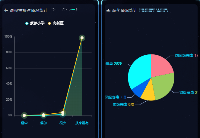 數(shù)據(jù)中臺還包含有試卷整體質(zhì)量分析、課程被擠占情況統(tǒng)計、美育獲獎情況統(tǒng)計。從不同指標把數(shù)據(jù)結(jié)果展示給學(xué)校領(lǐng)導(dǎo)層。