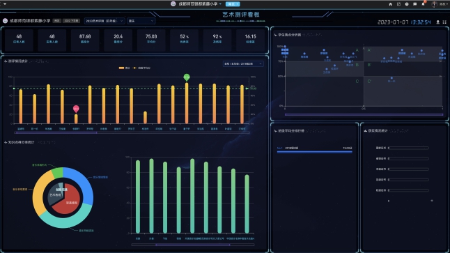 為了推動和促進藝術(shù)教育更好地開展,建立健全學(xué)校藝術(shù)教育工作評價制度,改進美育教學(xué),提高學(xué)生的審美和人文素養(yǎng),促進學(xué)生全面健康成長。建設(shè)藝術(shù)素質(zhì)評價系統(tǒng),借助該測評系統(tǒng),可以真實有效記錄學(xué)生個性化發(fā)展趨勢,通過課中數(shù)據(jù)、課后發(fā)展數(shù)據(jù)及最終評測結(jié)果紀實留存,數(shù)據(jù)多維度分析,從而為教師及美育工作管理者提供數(shù)據(jù)支持,因材施教。而藝術(shù)評價數(shù)據(jù)中臺能夠進行數(shù)據(jù)實現(xiàn)可視化統(tǒng)一管理,學(xué)校領(lǐng)導(dǎo)可實時查看各年級、各班級過程性數(shù)據(jù)、終結(jié)性數(shù)據(jù)、美育測評數(shù)據(jù)分析報告等內(nèi)容,最大程度的實現(xiàn)“以美育人、以美化人、以美培元”的工作目標。