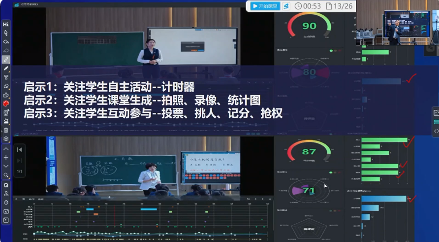本次活動(dòng)由寶雞高新第三小學(xué)校長李琳主持。 寶雞高新區(qū)教體局局長唐宏致辭,他指出,智慧教育是面向未來的教育模式,高新區(qū)教體局頂層設(shè)計(jì),統(tǒng)籌部署,全力推進(jìn)智慧教育發(fā)展,通過先進(jìn)的信息化教育技術(shù)和智能化的學(xué)習(xí)平臺(tái),推動(dòng)教育教學(xué)的創(chuàng)新和升級(jí),激發(fā)學(xué)生創(chuàng)造力,提高學(xué)生綜合素養(yǎng)。 上海金茂教育研究院院長程紅兵做題為《面向未來的教育是培養(yǎng)創(chuàng)造力的教育》的專題報(bào)告,他提出,面向未來的教育是培養(yǎng)創(chuàng)造力的教育,創(chuàng)造力的核心是想象力的培養(yǎng),而課程設(shè)計(jì)成為培養(yǎng)思維的關(guān)鍵,讓學(xué)生真實(shí)的學(xué)習(xí)才是教學(xué)價(jià)值的所在。 四川教育研究會(huì)教師發(fā)展專委會(huì)副理事長徐猛做題為《素養(yǎng)導(dǎo)向下的教什么與怎么教》的專題報(bào)告,關(guān)于“教”他給的建議是:越上位的觀念越具有統(tǒng)攝性,越上位的觀念越具有遷移性,教學(xué)要注重本身的學(xué)科性。不同的知識(shí)應(yīng)該有不同的學(xué)習(xí)過程,高質(zhì)量的學(xué)習(xí)沒有固定的教學(xué)模式。“教什么”和“怎么教”二者相互影響,相互促進(jìn)。 在大會(huì)現(xiàn)場(chǎng),寶雞高新第三小學(xué)王清老師、西南財(cái)經(jīng)大學(xué)附屬實(shí)驗(yàn)小學(xué)周靜老師、西寧市陽光小學(xué)張君君老師、珠海市香洲區(qū)第六小學(xué)宣立雨老師分別做了一堂智慧語文課、智慧數(shù)學(xué)課、智慧美術(shù)課和智慧科學(xué)課。老師們采用自主學(xué)習(xí)、合作探討等教學(xué)模式,激發(fā)學(xué)生的主動(dòng)探索與知識(shí)共享,在HiTeach 5智慧教學(xué)系統(tǒng)賦能下的課堂,既關(guān)注到學(xué)生小組整體、組與組之間的差別,也關(guān)注到學(xué)生個(gè)體、個(gè)體和個(gè)體的表現(xiàn)差異,利用信息化技術(shù)真正做到了教學(xué)中對(duì)整體與個(gè)體的兼顧。 四位老師上課過程中,同步開啟智慧教研流程,觀摩老師和嘉賓通過掃碼即可進(jìn)行議課評(píng)課。觀摩嘉賓可以通過多維度觀察課堂情況,以文字、照片、錄音、錄像方式記錄觀察重點(diǎn)內(nèi)容,打破傳統(tǒng)紙筆記錄的限制,點(diǎn)評(píng)意見更加契合教學(xué)過程,授課教師能通過解讀系統(tǒng)中的生成性評(píng)價(jià)數(shù)據(jù)及其他教師的評(píng)語改進(jìn)自身的課堂教學(xué)方法和教學(xué)策略,助力課堂教學(xué)質(zhì)量的提高,提升自身專業(yè)成長。 劉彬教授帶來基于AI人工智能聯(lián)合教研的觀察報(bào)告,報(bào)告中,他從蘇格拉底平臺(tái)的AI評(píng)分,專家點(diǎn)評(píng)意見入手,從不同維度進(jìn)行深入分析,肯定了老師們智慧教育手段的應(yīng)用能力,展示了蘇格拉底平臺(tái)中各位專家,老師的點(diǎn)評(píng)意見,提煉了聽課評(píng)課的最佳有效方式,希望在AI人工智能的加持下,區(qū)域智慧教育持續(xù)“起飛”~ 本次活動(dòng)聯(lián)合寶雞、成都、西寧、珠海四地學(xué)校,以智慧課堂為抓手,共同探索研究“智慧教研、智慧課堂、智慧評(píng)價(jià)”等利用人工智能、大數(shù)據(jù)的現(xiàn)代教育技術(shù),助推教師專業(yè)成長,培養(yǎng)學(xué)生全面發(fā)展,打造“課堂文化發(fā)展”品牌,推進(jìn)各區(qū)域內(nèi)學(xué)校高質(zhì)量發(fā)展。