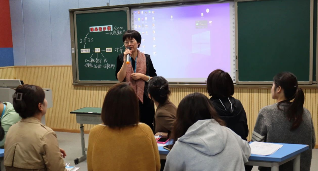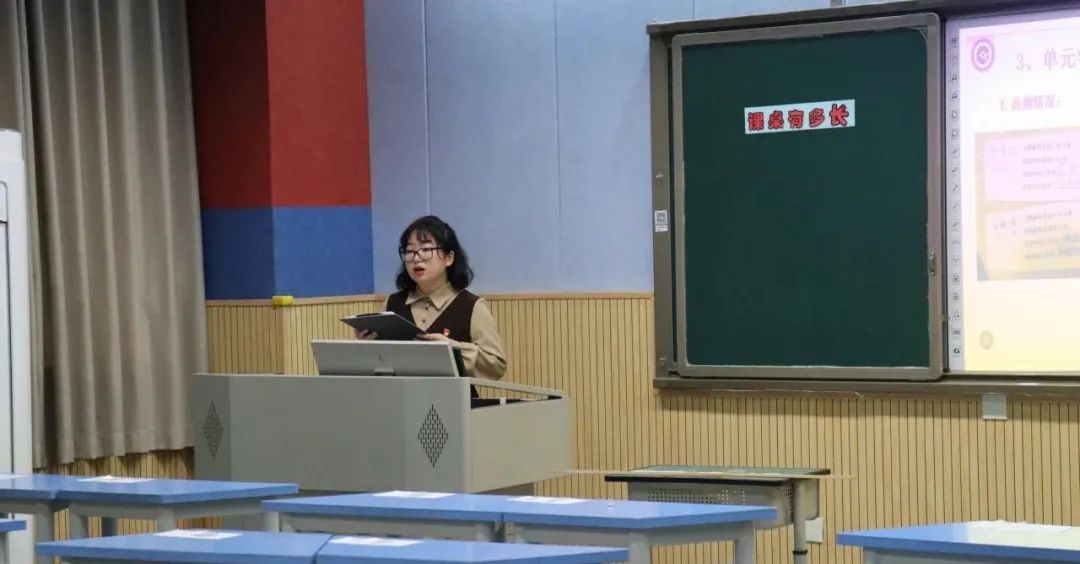 數(shù)學(xué)組以北師大版小學(xué)數(shù)學(xué)二年級(jí)上冊(cè)《課桌有多長(zhǎng)》為例進(jìn)行常態(tài)三段式教研展示,將學(xué)校技術(shù)賦能的課堂教學(xué)與教研常態(tài)進(jìn)行真實(shí)呈現(xiàn)。課前,王鑫老師進(jìn)行陳述。王老師從單元課標(biāo)要求、內(nèi)容分析、學(xué)情分析、目標(biāo)確定、核心素養(yǎng)的剖析等方面入手,從大單元教學(xué)的視角對(duì)本課課例設(shè)計(jì)進(jìn)行了說(shuō)明。