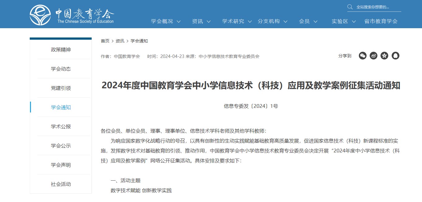 4月底,中國教育學會發(fā)布通知,開展2024年度中國教育學會中小學信息技術(科技)應用及教學案例征集活動。