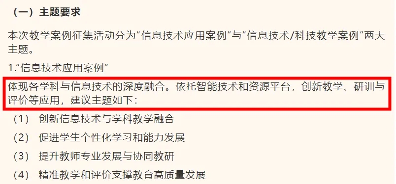 “信息技術應用案例”要求中提到,要體現(xiàn)各學科與信息技術的深度融合。依托智能技術和資源平臺,創(chuàng)新教學、研訓與評價等應用。
