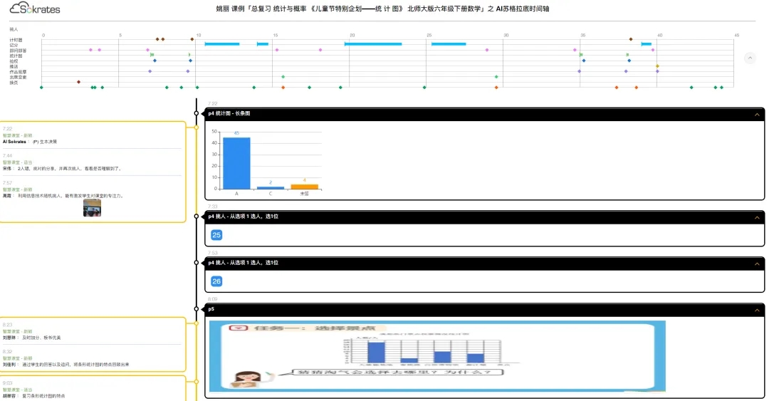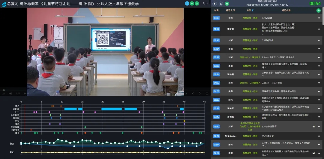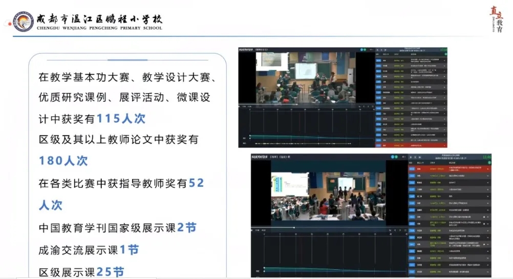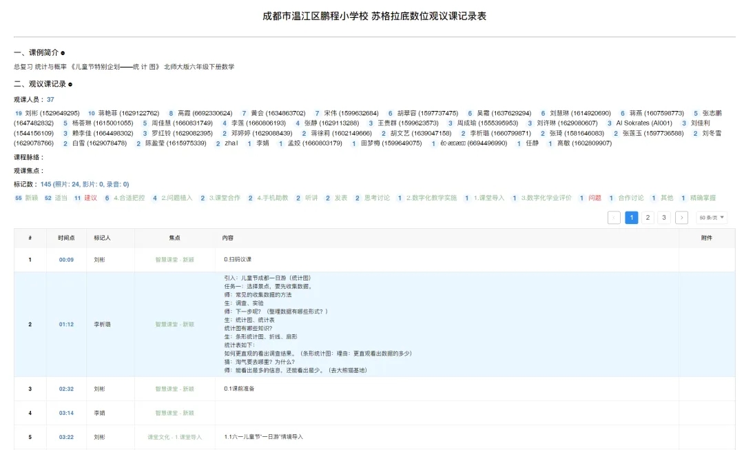 高敏老師基于AI融合自主生成的本節(jié)課數(shù)據(jù)質(zhì)量評(píng)估報(bào)告做人機(jī)智慧下的實(shí)證教研。各年級(jí)數(shù)學(xué)教研組的老師們通過智慧系統(tǒng)中的標(biāo)記點(diǎn)對(duì)姚麗老師的課進(jìn)行精準(zhǔn)議課教研。 蘇格拉底時(shí)間軸-快速瀏覽課堂內(nèi)容及專家打點(diǎn)評(píng)論 杭州采荷第一小學(xué)教育集團(tuán)的孫校長(zhǎng)表示鵬程小學(xué)的智慧課堂體現(xiàn)了技術(shù)的熟練運(yùn)用和數(shù)據(jù)的精準(zhǔn)調(diào)控。采荷小學(xué)的老師們也表示現(xiàn)代信息技術(shù)與課堂的融合是遵循了科技的發(fā)展,為學(xué)生的教育提供更好的平臺(tái),實(shí)現(xiàn)智慧眾籌。 張琦主任就姚老師的課堂對(duì)學(xué)校切片式教研進(jìn)行介紹,提到智慧課堂的三個(gè)智慧:設(shè)備的智慧、教師教學(xué)設(shè)計(jì)的智慧、學(xué)生在課堂學(xué)習(xí)中的智慧,并強(qiáng)調(diào)數(shù)學(xué)的學(xué)習(xí)要回歸于真實(shí)生活當(dāng)中,這也是學(xué)生必須具備的數(shù)學(xué)學(xué)習(xí)的核心素養(yǎng)。 此次課堂聯(lián)盟的交流活動(dòng),不僅讓友好學(xué)校了解鵬程小學(xué)的校園建設(shè)和教學(xué)改革發(fā)展,也在互動(dòng)交流中促進(jìn)學(xué)??沙掷m(xù)發(fā)展。 成都市溫江區(qū)鵬程小學(xué)校以“一化兩課三特色”為路徑,基于“三立”課堂和“直立”課程,深耕智慧教育,將教育數(shù)字化和“三立”課堂深度融合,打造合作式、碰撞式、探究式的課堂文化氛圍,實(shí)現(xiàn)數(shù)字化工具有效地融合于教育教學(xué)的全過程。學(xué)校三立課堂+智慧教育教學(xué)特色,受到多地教育同仁的參訪學(xué)習(xí)。 鵬程小學(xué)在教師發(fā)展上,致力于培養(yǎng)智慧型骨干領(lǐng)軍教師,開展直立智慧課堂駕校班,利用扎實(shí)專題培訓(xùn),培養(yǎng)教師從種子教師、菁英教師、領(lǐng)航教師一路成長(zhǎng),以團(tuán)隊(duì)研修促進(jìn)教師數(shù)字化素養(yǎng)快速提升,經(jīng)過近年的超速發(fā)展,真正實(shí)現(xiàn)了對(duì)傳統(tǒng)教學(xué)結(jié)構(gòu)的根本性變革。 點(diǎn)擊圖片登錄醍摩豆ID進(jìn)入鵬程小學(xué)專屬頻道