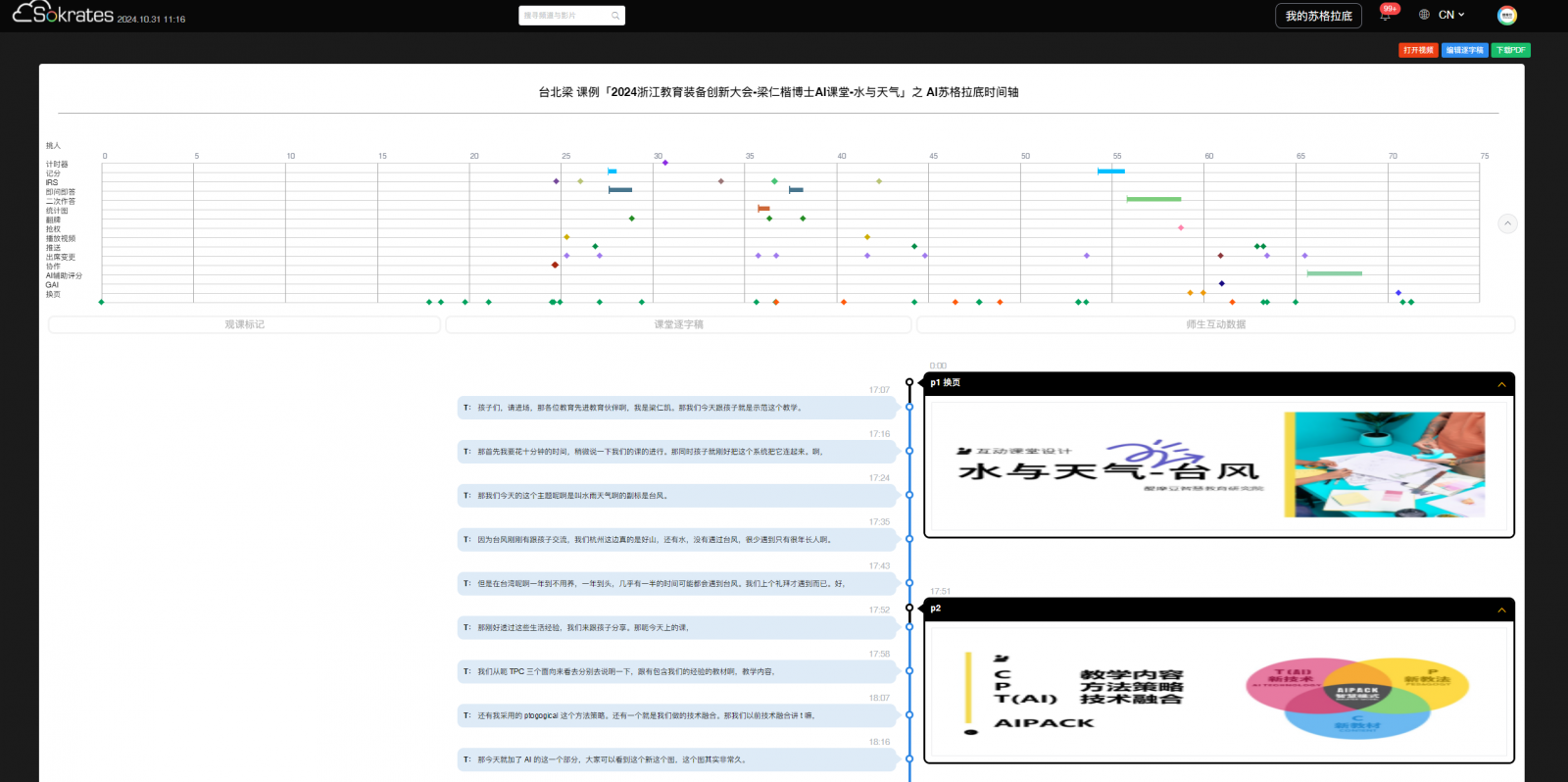 現(xiàn)將七年級科學《水與天氣》的數(shù)位觀議課課例資訊(包括蘇格拉底影片、AI蘇格拉底時間軸、教學模式之課堂分析S-T圖)展示如下: