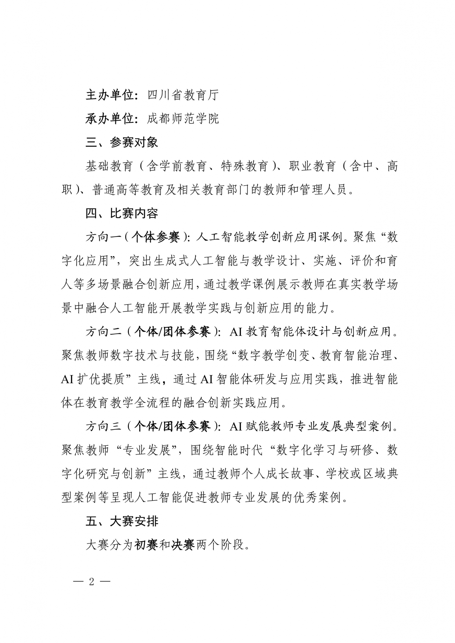 本次大賽以“AI 賦能教師專業(yè)發(fā)展,數(shù)智創(chuàng)變未來課堂”為主題,由四川省教育廳主辦、成都師范學(xué)院承辦,是四川省首屆聚焦教師人工智能應(yīng)用能力的大規(guī)模、高水準(zhǔn)省級賽事。大賽覆蓋范圍廣泛,面向四川省基礎(chǔ)教育(含學(xué)前教育、特殊教育)、職業(yè)教育(涵蓋中、高職)及普通高等教育領(lǐng)域的所有在職教師及管理人員,比賽內(nèi)容多樣:包含人工智能教學(xué)創(chuàng)新應(yīng)用課例(聚焦“數(shù)字化應(yīng)用”),AI教育智能體設(shè)計(jì)與創(chuàng)新應(yīng)用(聚焦數(shù)字技術(shù)與技能),AI賦能教師專業(yè)發(fā)展典型案例(聚焦教師“專業(yè)發(fā)展”)三大板塊。