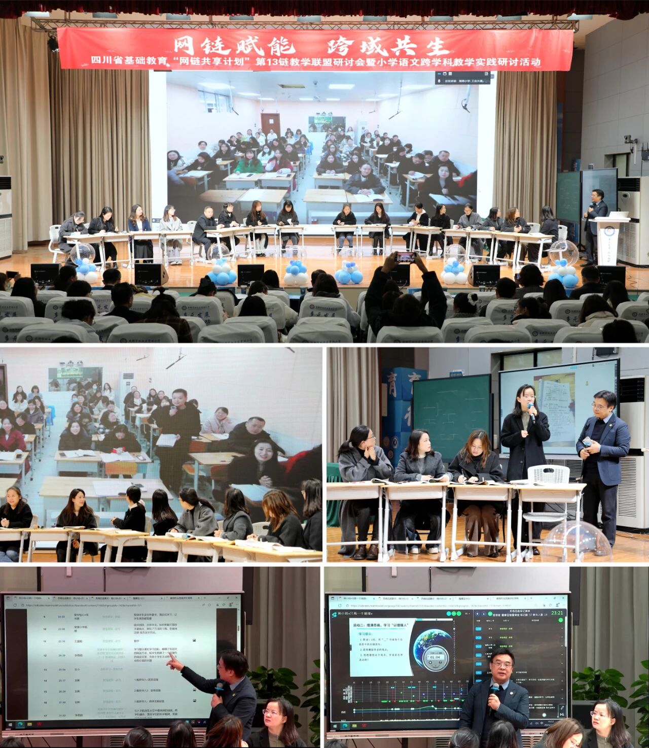 為打破跨區(qū)域教育資源流通的壁壘,探索小學(xué)語文跨學(xué)科教學(xué)的創(chuàng)新方向,11月26日,四川省基礎(chǔ)教育“網(wǎng)鏈共享計(jì)劃”第13鏈教學(xué)聯(lián)盟研討會(huì)暨小學(xué)語文跨學(xué)科教學(xué)實(shí)踐研討活動(dòng),在成都市雙流區(qū)棠湖小學(xué)成功舉行。 成都大學(xué)師范學(xué)院副院長黃云峰,成都大學(xué)師范學(xué)院教授譚梅,雙流區(qū)教育局黨組副書記、副局長王輝,《中國教育學(xué)刊》四川省學(xué)用刊中心副主任劉彬,普教科負(fù)責(zé)人王曉玉,區(qū)教育科學(xué)研究院院長譚紅,第13鏈教學(xué)聯(lián)盟學(xué)校,區(qū)域內(nèi)部分網(wǎng)鏈學(xué)校負(fù)責(zé)人以及學(xué)校全體語文教師參加了本次活動(dòng),共同見證了這場跨區(qū)域教育協(xié)同創(chuàng)新實(shí)踐的落地。 本次活動(dòng)以“網(wǎng)鏈賦能?跨域共生”為核心主題,采用“線上+線下”雙軌模式,吸引了資陽、涼山、雙流三地20余所聯(lián)盟校的數(shù)百名教育工作者參與其中。活動(dòng)依托醍摩豆HiTeach智慧教學(xué)系統(tǒng)搭建遠(yuǎn)程互動(dòng)課堂,通過AI蘇格拉底系統(tǒng)構(gòu)建智慧教研聯(lián)動(dòng)平臺(tái),打破地域限制,實(shí)現(xiàn)兩地教師“同屏共研、實(shí)時(shí)互動(dòng)”,為跨區(qū)域教育協(xié)同發(fā)展搭建了高效、智能的全新平臺(tái),助力構(gòu)建“優(yōu)勢互補(bǔ)、資源共享、協(xié)同共進(jìn)”的教育新生態(tài)。