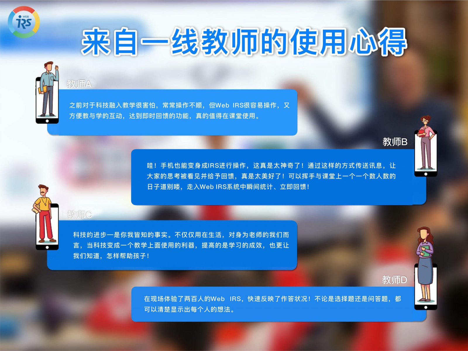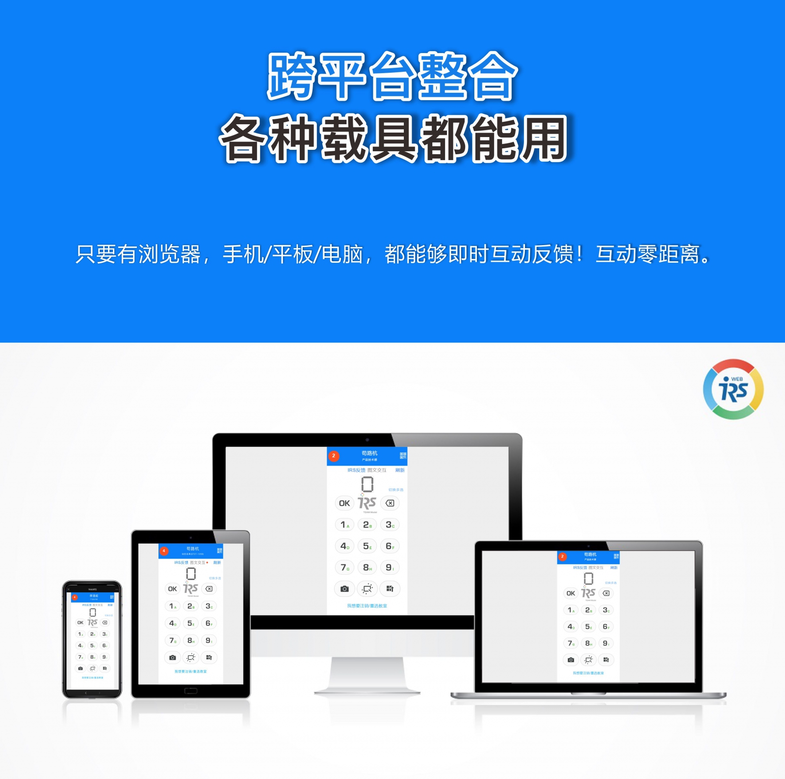 IRS實(shí)時(shí)反饋系統(tǒng)行之有年,也有相當(dāng)多研究指出確實(shí)能夠幫助到學(xué)生的學(xué)習(xí)動機(jī)及成績提升,在現(xiàn)今幾乎人人擁有平板、手機(jī)、計(jì)算機(jī)的時(shí)代,醍摩豆全新推出Web IRS,完全不用安裝任何軟件,手機(jī)、平板、計(jì)算機(jī),只要有瀏覽器,就可以讓師生不受時(shí)空限制,互動反饋,傳送圖片、文字、快速答題統(tǒng)計(jì)、附注說明…等,讓每個(gè)學(xué)生都能實(shí)時(shí)發(fā)表自己的意見與想法,讓老師即使掌握學(xué)生思考,幫助老師數(shù)據(jù)決策!