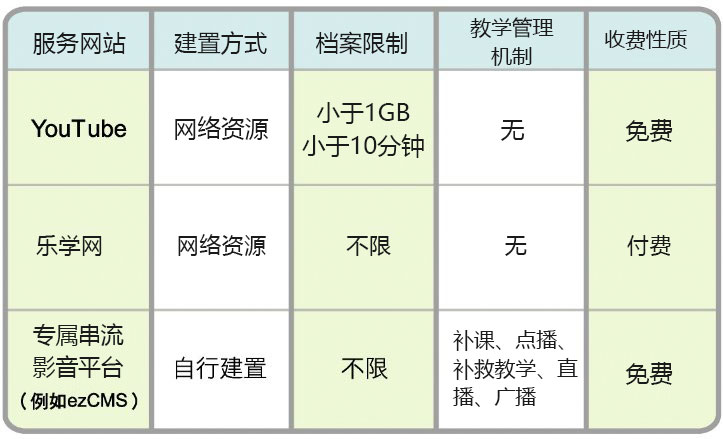 YouTube是大家熟知免費(fèi)的串流影音服務(wù)平臺,我們不但可以隨時從上面看到世界各地發(fā)送上來的影片,也可以把自己的影片發(fā)送到Y(jié)ouTube。不過,把這種服務(wù)平臺應(yīng)用到學(xué)校的教學(xué)中,還是有許多需要克服的問題,例如文件大小限制、時間限制、課程管理、知識產(chǎn)權(quán)、商業(yè)廣告等多重問題。 此外,也有補(bǔ)教業(yè)者建置的串流影音平臺,提供學(xué)生付費(fèi)上網(wǎng)觀看影音教材。前述兩類影音平臺,實(shí)際應(yīng)用到教學(xué)上,都存在一些問題,若經(jīng)費(fèi)許可,由學(xué)校自行創(chuàng)建具有教學(xué)管理機(jī)制(包含教材發(fā)送、課程管理、權(quán)限管理、帶寬管理等)的影音串流平臺,并結(jié)合自動化的 錄播系統(tǒng),可以發(fā)展出比較理想的e化教學(xué)環(huán)境。