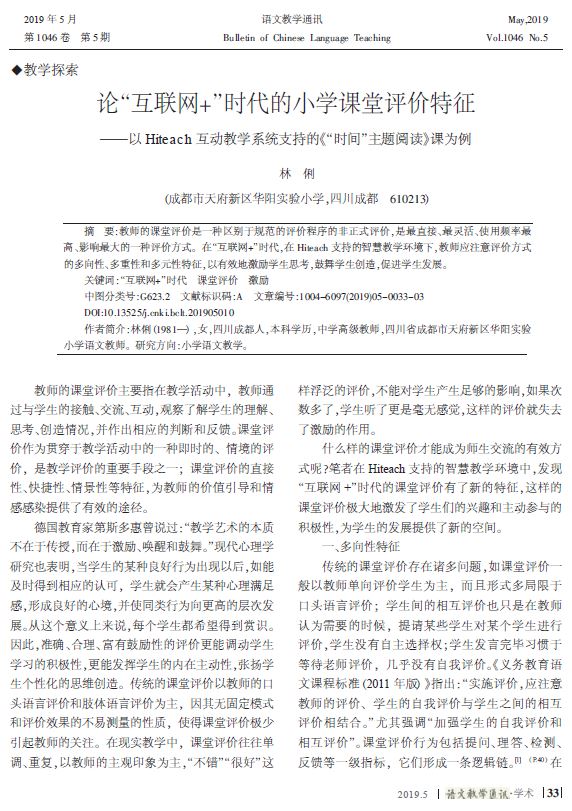 成都市天府新區(qū)華陽(yáng)實(shí)驗(yàn)小學(xué)林俐老師論文《論”互聯(lián)網(wǎng)+”時(shí)代的小學(xué)課堂評(píng)價(jià)特征-以Hiteach互動(dòng)教學(xué)系統(tǒng)支持的「”時(shí)間”主題閱讀」課為例》收錄于中國(guó)學(xué)術(shù)期刊《語文教學(xué)通訊》2019年5月,第1046 卷第5 期。