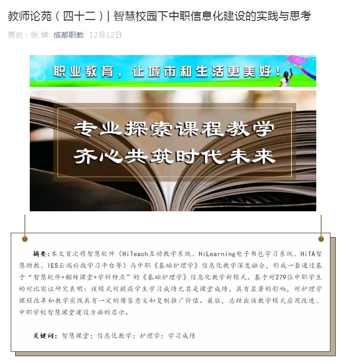 成都市鐵路衛(wèi)生學校張蝶老師論文《智慧校園下中職信息化建設的實踐與思考》收錄于成都專業(yè)教育媒體成都職教《教師論苑第四十二期》2019年12月12日。成都鐵路衛(wèi)生學校