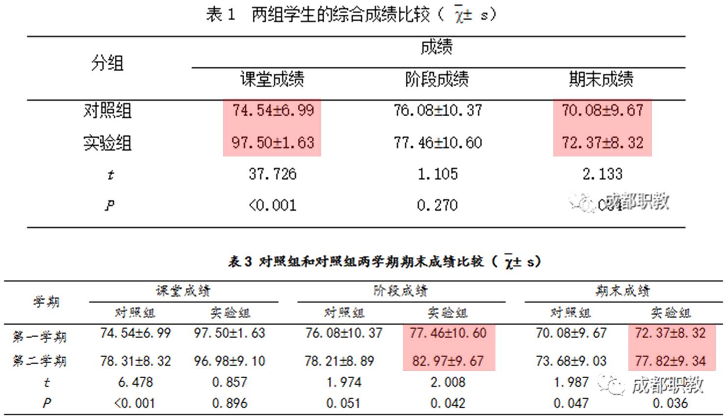 第一學期實驗組的課堂成績與期末考試成績均高于對照組(表1)