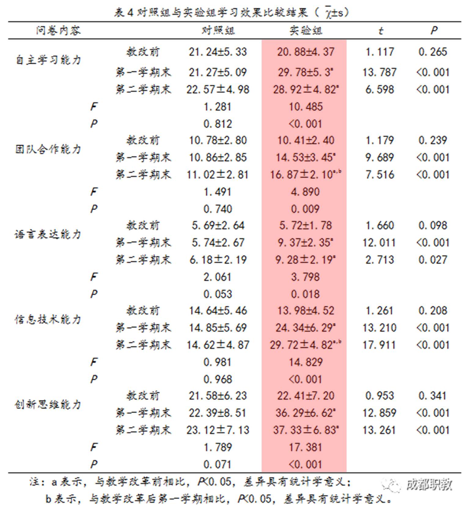 實驗組第一學期和第二學期在五個維度間的得分均高于教學改革前。