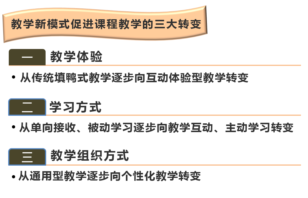 在教學體驗上,從傳統(tǒng)填鴨式教學逐步向互動體驗型教學轉(zhuǎn)變;在學習方式上,從單向接收、被動學習逐步向教學互動、主動學習轉(zhuǎn)變;在教學組織方式上,從通用型教學逐步向個性化教學轉(zhuǎn)變。