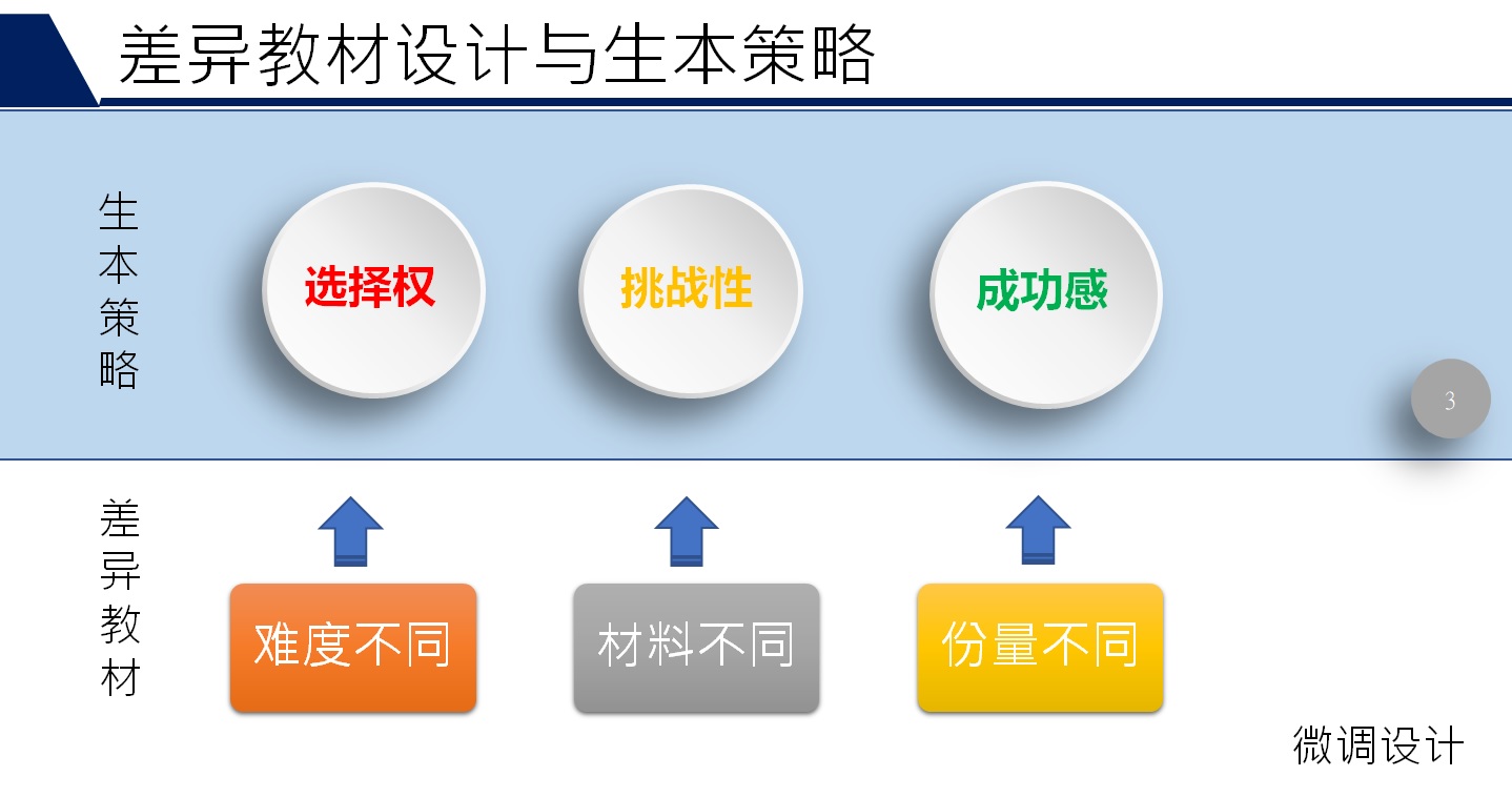 差異教材設(shè)計與因材施教 三、差異教材設(shè)計與生本策略 從學(xué)生角度(生本策略),營造具有選擇權(quán)、充滿挑戰(zhàn)性和容易成功感的學(xué)習(xí)情境,教師準(zhǔn)備豐富的差異化教材,進行同步差異化教學(xué)
