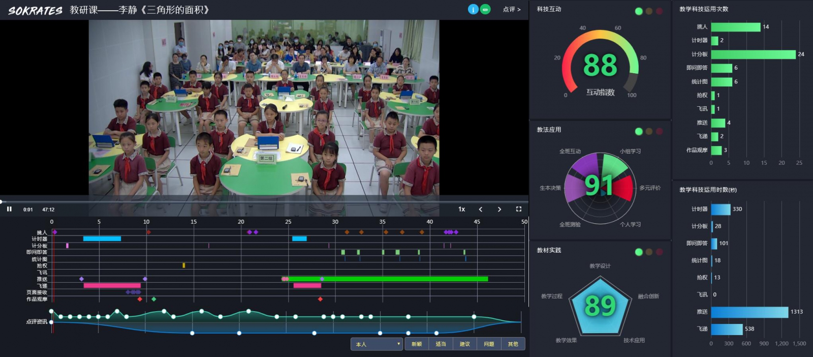 本環(huán)節(jié),通過倒計(jì)時(shí)給予學(xué)生充足的時(shí)間去合作探究,互相啟發(fā)、自主探索,然后通過推送、飛遞、反推送,實(shí)現(xiàn)知識共享,產(chǎn)生思維碰撞,讓學(xué)生在觀察體驗(yàn)、探究交流、匯報(bào)展示突破本節(jié)課的重難點(diǎn)。同時(shí)小組之間存在競爭關(guān)系,利用倒計(jì)時(shí)推動學(xué)生在有限的時(shí)間里動腦思考更多驗(yàn)證方法。小組匯報(bào)環(huán)節(jié),采用隨機(jī)挑人以及智慧挑人相結(jié)合,給予每個學(xué)生展示自我的機(jī)會,并全面考察學(xué)生的探究過程中存在的疑問,然后通過生生互助互答,解決疑難問題。探究結(jié)束,通過倒計(jì)時(shí)讓生嘗試計(jì)算三角形的面積并通過Hita 拍照學(xué)生作品進(jìn)行批注點(diǎn)評,提高教學(xué)效率與質(zhì)量。