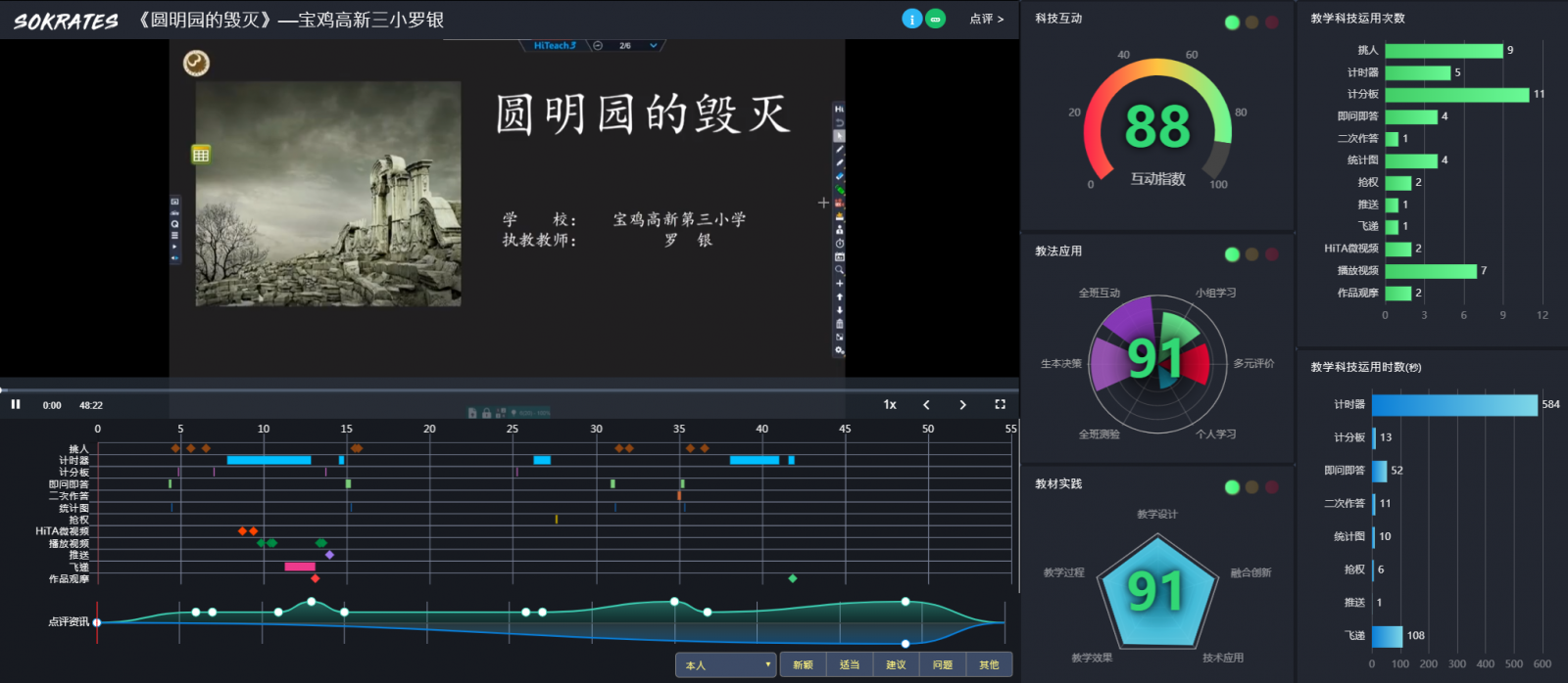 羅銀老師的五年級語文課堂《圓明園的毀滅》,從問題導(dǎo)入,看見學(xué)生的認(rèn)知;用數(shù)據(jù)決策,導(dǎo)引學(xué)習(xí)的方式;借助技術(shù)讓思維過程和思維結(jié)果可視,看見了學(xué)習(xí)真正發(fā)生在學(xué)生學(xué)習(xí)的過程中,讀寫結(jié)合中練就語文學(xué)習(xí)力,促進學(xué)生心智成長。整堂課以作者的情感變化為線索。羅老師利用手機助教,二次作答,智慧挑人,差異化推送等組合功能,關(guān)注每位學(xué)生的學(xué)習(xí)生成,利用二次作答實現(xiàn)真正意義上的思維生長,學(xué)生的語文思辨在學(xué)習(xí)過程中體現(xiàn),通過學(xué)習(xí),學(xué)生前后對比發(fā)現(xiàn)說明文與散文的文體特征,得出學(xué)生自主觀點,使學(xué)生真正成為課堂的主體。
