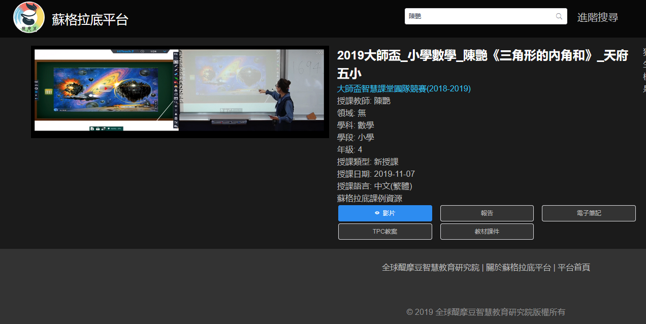 4. 2018年11月的「 2018年醍摩豆杯智慧課堂創(chuàng)新競(jìng)賽」上,榮獲團(tuán)隊(duì)一等獎(jiǎng)。多次受邀在天府五小分享智慧教室教學(xué)心得,培訓(xùn)種子教師。 經(jīng)典課例 四年級(jí)數(shù)學(xué)《三角形的內(nèi)角和》