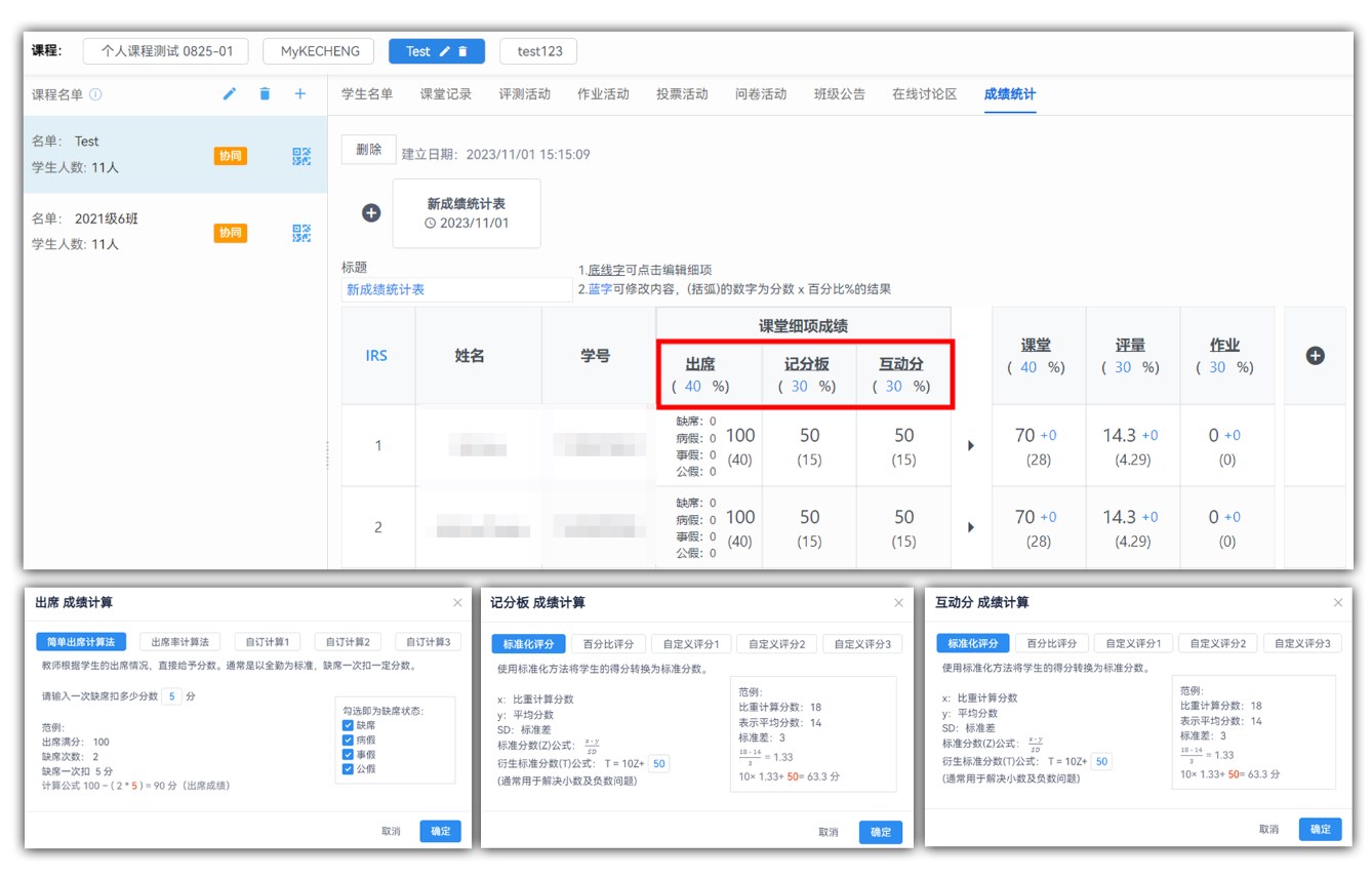切換到完整模式后,若點選出席、記分板、互動分可分別出現(xiàn)出席、記分板、互動分的成績計算畫面,您可以變更計算方式,以符合自己的評量原則。