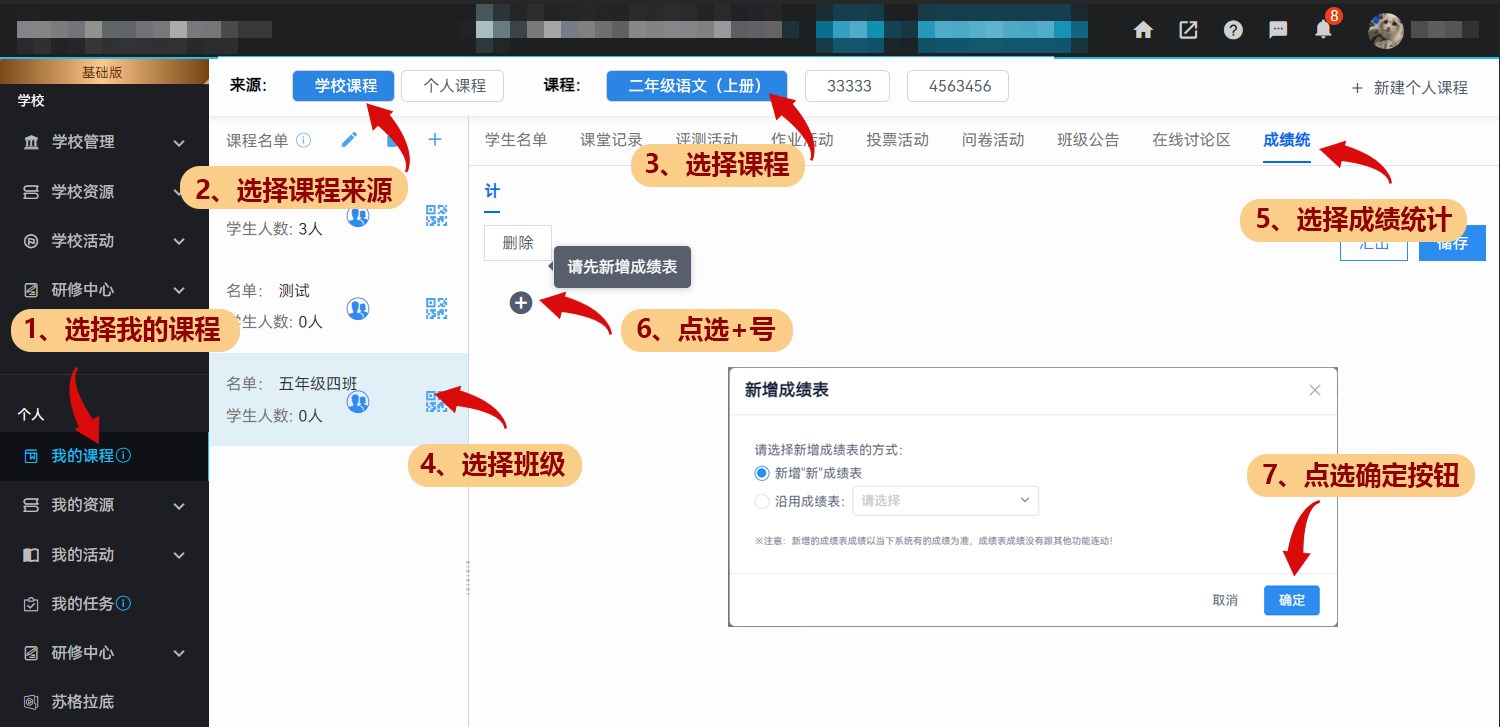 在IES中,選擇我的課程,接著選擇課程來源(個人課程或學(xué)校課程),再選擇課程名稱,然后選擇要結(jié)算成績的班級,接下來,選擇成績統(tǒng)計,第一次使用需要點選+號新增成績表,再點選確定鈕。(教師可以建立多份成績試算表,以便比較分析不同算法與成績)