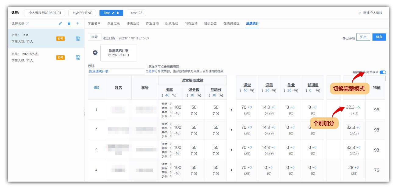 總成績自動算好之后,假如想為某個特殊表現(xiàn)學(xué)生加分,可以切換到完整模式下,點選該學(xué)生總評分欄旁邊的藍色數(shù)字,輸入額外加分數(shù)字,非常方便。