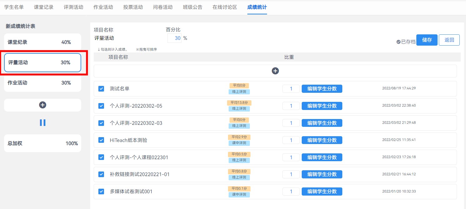 系統(tǒng)預(yù)設(shè)包含課堂、評量、作業(yè)等三大類評量類型,其分數(shù)的整體占比可以修改。只要曾經(jīng)使用IES個人課程或?qū)W校課程進行的活動紀(jì)錄,平臺會依據(jù)評量類型以及歷次活動數(shù)據(jù)的得分紀(jì)錄自動歸類,然后根據(jù)得分與分數(shù)占比自動計算,列出這一班每位學(xué)生所得到的總評分。