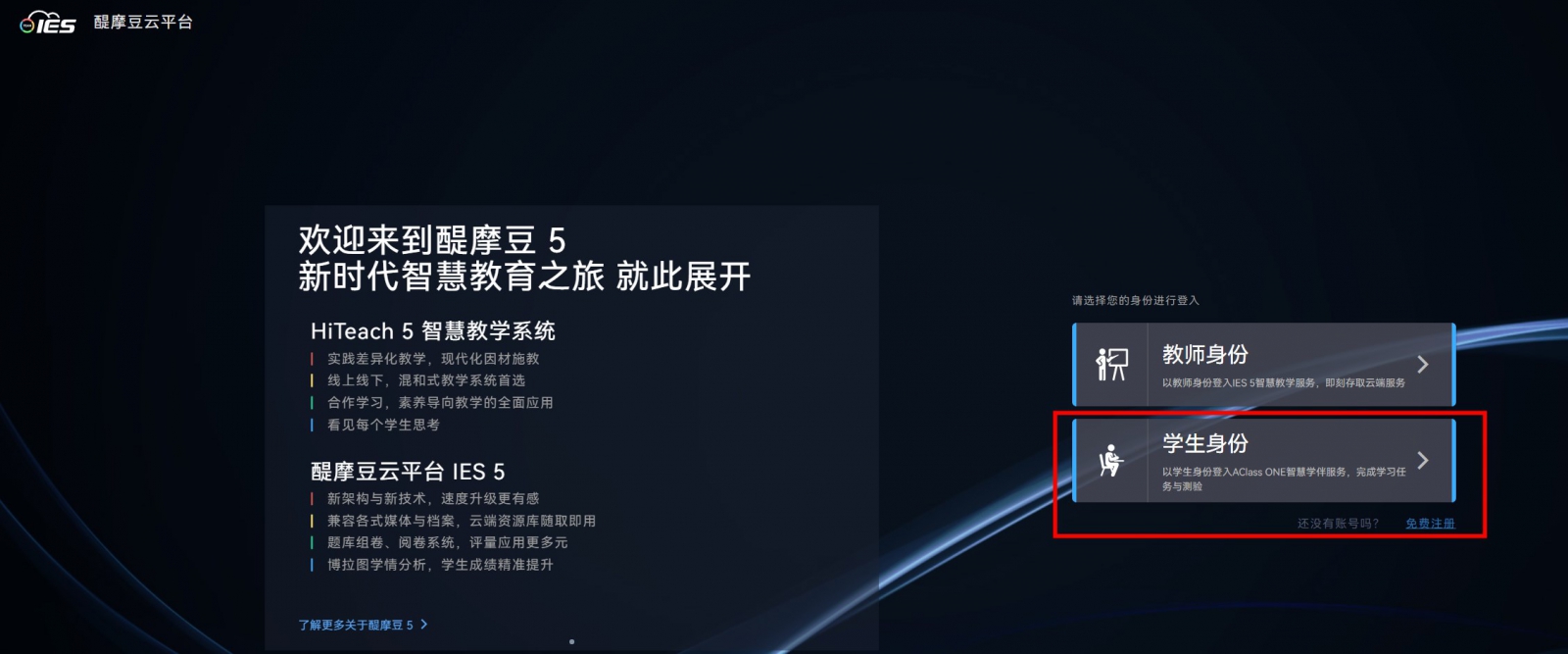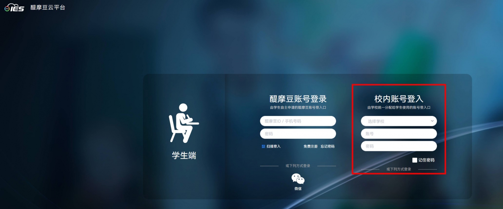 學生端:學校有采購IES智慧學校管理功能,則學生可以學校建立的校內(nèi)賬號來登錄使用。若教師使用個人課程,則學生需要自行注冊醍摩豆賬號,并加入教師的課程。