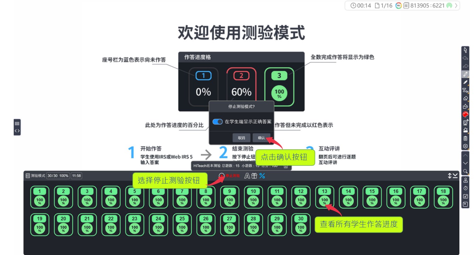 老師端的HiTeach上可以查看學生作答的進度,所有學生作答完成或到達停止作答時間時,點選停止測驗鈕,出現(xiàn)提示視窗后,點選確認鈕。系統(tǒng)會提示試卷包含主觀題,需以交換改或者由老師在線批閱給分后,才能計算完整成績,學生課后也才能檢視與復習。此外,老師也可以決定停止測驗后學生端是否要顯示批改的答案。