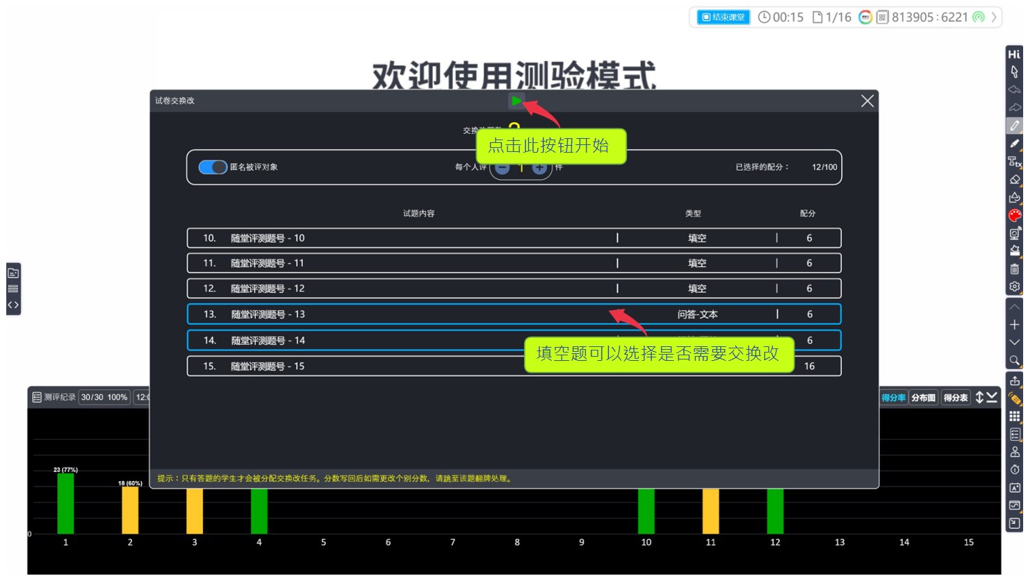 出現(xiàn)試卷交換改視窗后,填充題亦可選擇列入交換改的項目(填充題答案可能會有全形、半形字符,或者同義詞等情況,可利用交換改來訂正給分;假如是方程式、化學式等答案,則在發(fā)起測驗設定時,請將此題設為問答題,以利學生作答),然后點選開始互評鈕。