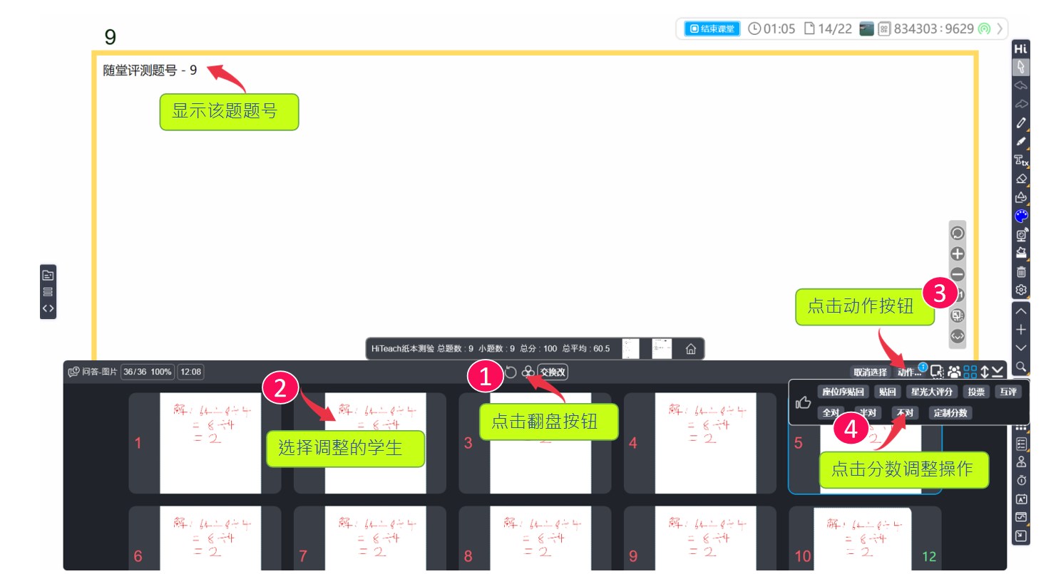 若有需要調整該題號個別學生的分數,也可以在此頁面中,點選翻牌鈕,再點選需要調整的學生,接著點選動作鈕,然后進行分數調整操作。
