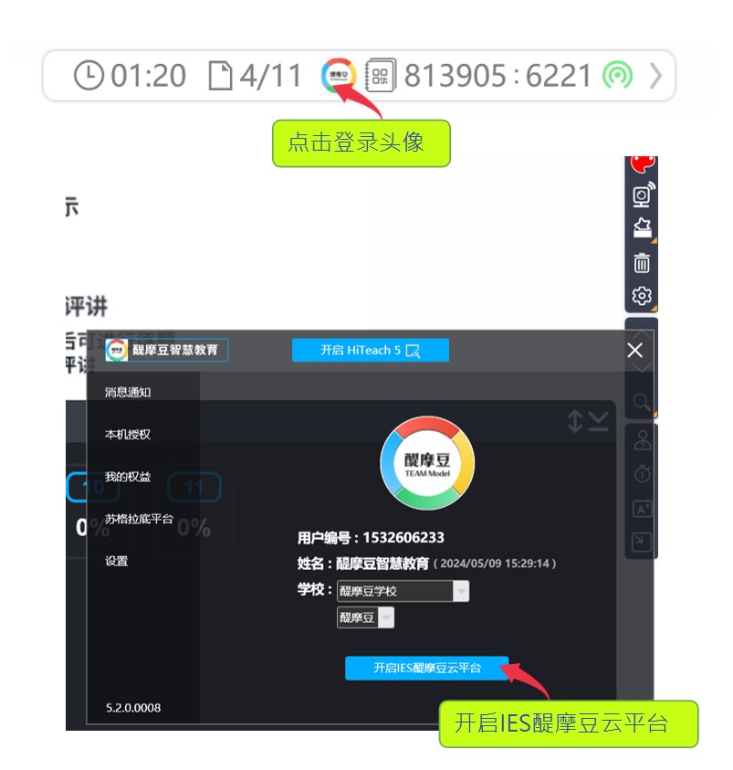 IES平臺是與HiTeach緊密搭配應用的云端后臺,評量結果會記錄到云端中,登入IES即可查閱或統(tǒng)計成績。最便利的進入IES方式是點選HiTeach的登入頭像,出現(xiàn)HiTeach助手畫面后,點選開啟IES醍摩豆云平臺鈕,就會開啟瀏覽器進入IES頁面并自動登入。