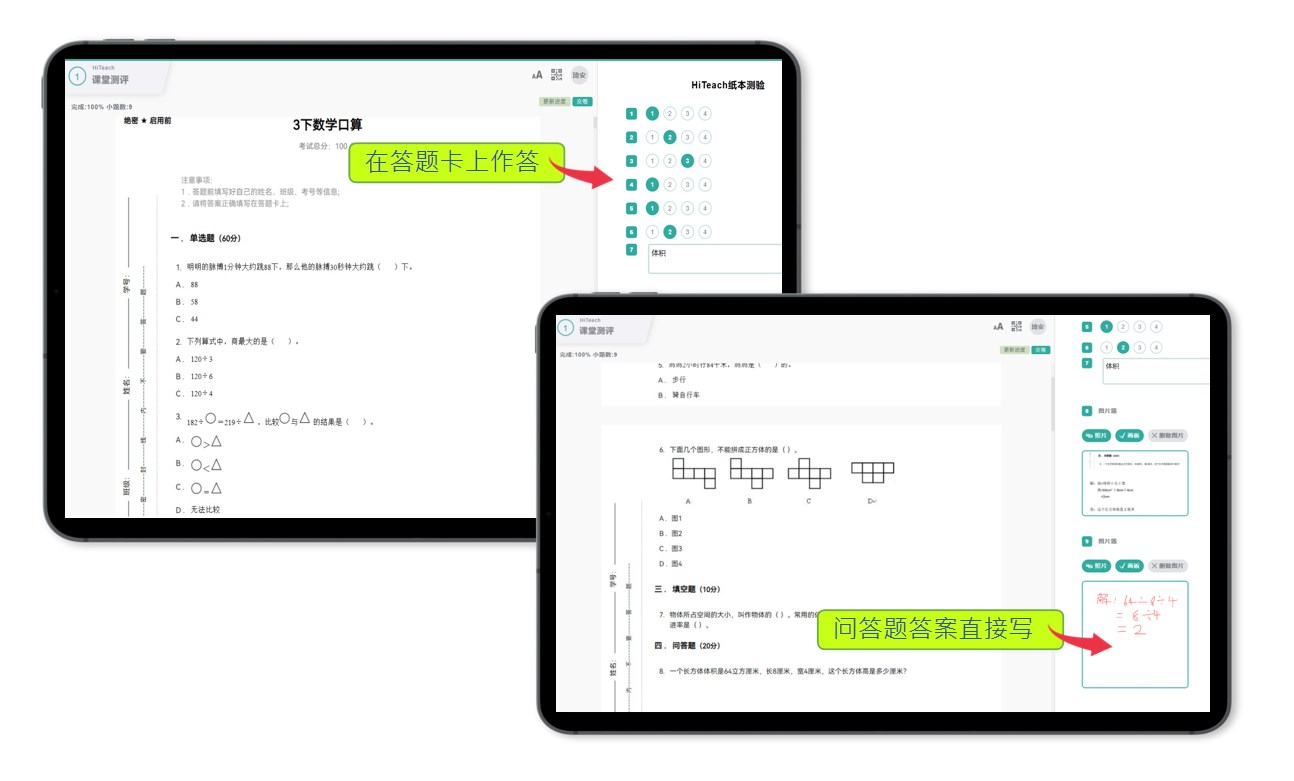 接下來,學生端的平板計算機上就會出現(xiàn)這次測驗的試卷,以及答題卡,開始進行答題操作,問答題的答案可以寫在紙上,然后拍照,或者利用畫板,直接在平板上書寫,最后點選交卷鈕。