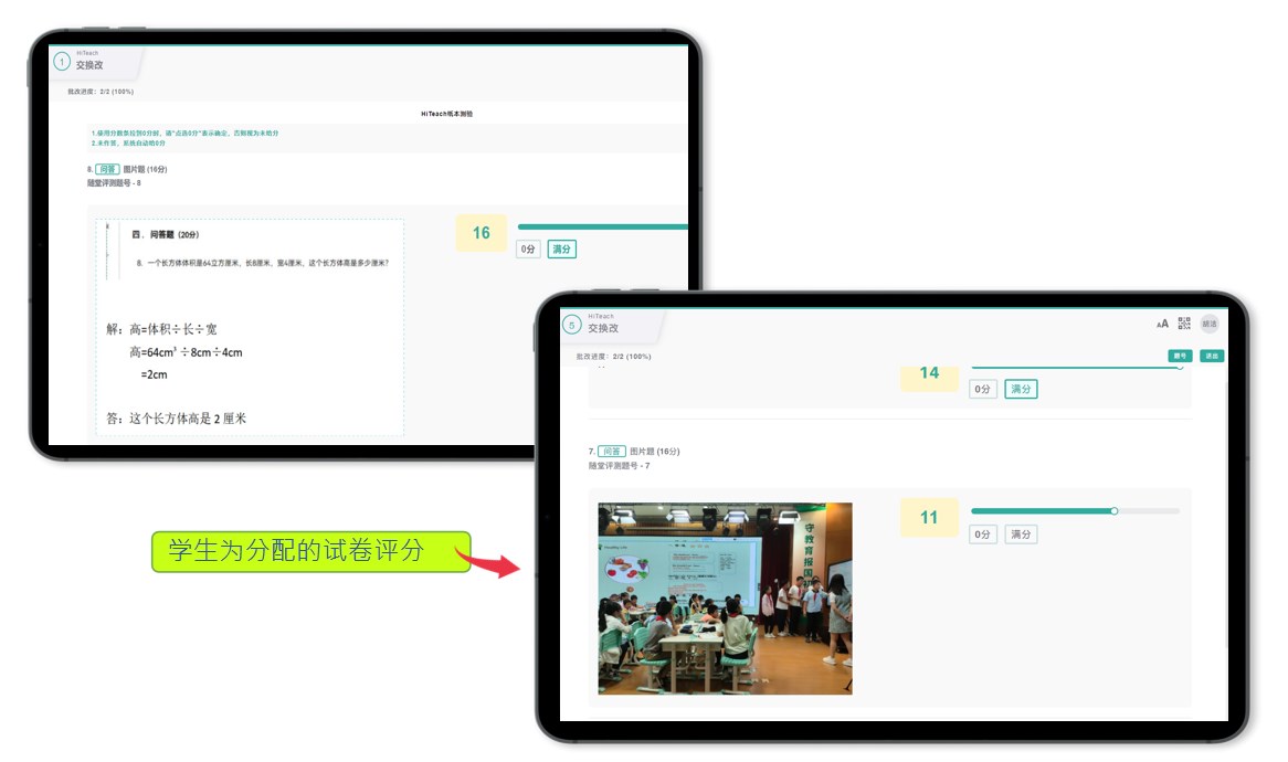 HiTeach「試卷交換改」是測驗模塊和智慧評分模塊的組合應用,按下試卷「交換改」鈕,設定一人一件、一人兩件或一人多件等分配方式后,就能立即派送到學生平板計算機上,由非本人批改試卷填充和問答題,根據教師公布的批改規(guī)準、答案示例給分。