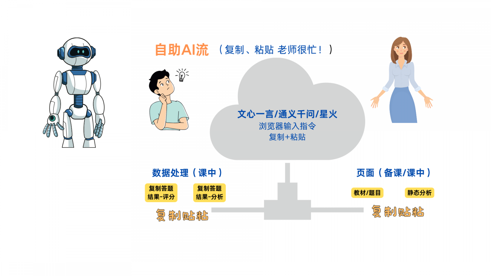 面對(duì)課堂上學(xué)生反饋生成的“活”數(shù)據(jù),應(yīng)用一般的AI對(duì)話方式來(lái)協(xié)助課堂教學(xué)中作品作業(yè)的評(píng)分、評(píng)語(yǔ)時(shí),教師需要不斷操作復(fù)制、粘貼,復(fù)制學(xué)生的作品給AI,再把AI回應(yīng)的評(píng)分評(píng)語(yǔ)復(fù)制到成績(jī)表單中,重復(fù)這種繁瑣的操作過(guò)程,才能完成所有學(xué)生的評(píng)分、評(píng)語(yǔ),這種操作方式,我們簡(jiǎn)稱為自助AI流。??HiTeach AI流(自動(dòng)對(duì)接)