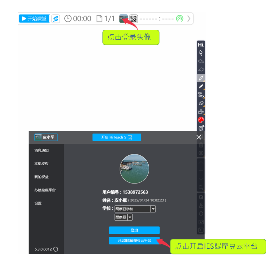 ?1.在HiTeach中點(diǎn)擊右上角課堂信息區(qū)的頭像,再從HiTeach助手點(diǎn)擊「開啟IES醍摩豆云平臺(tái)」。