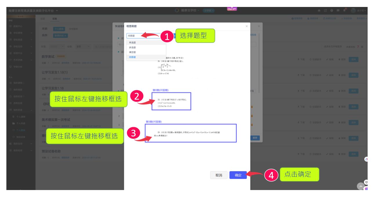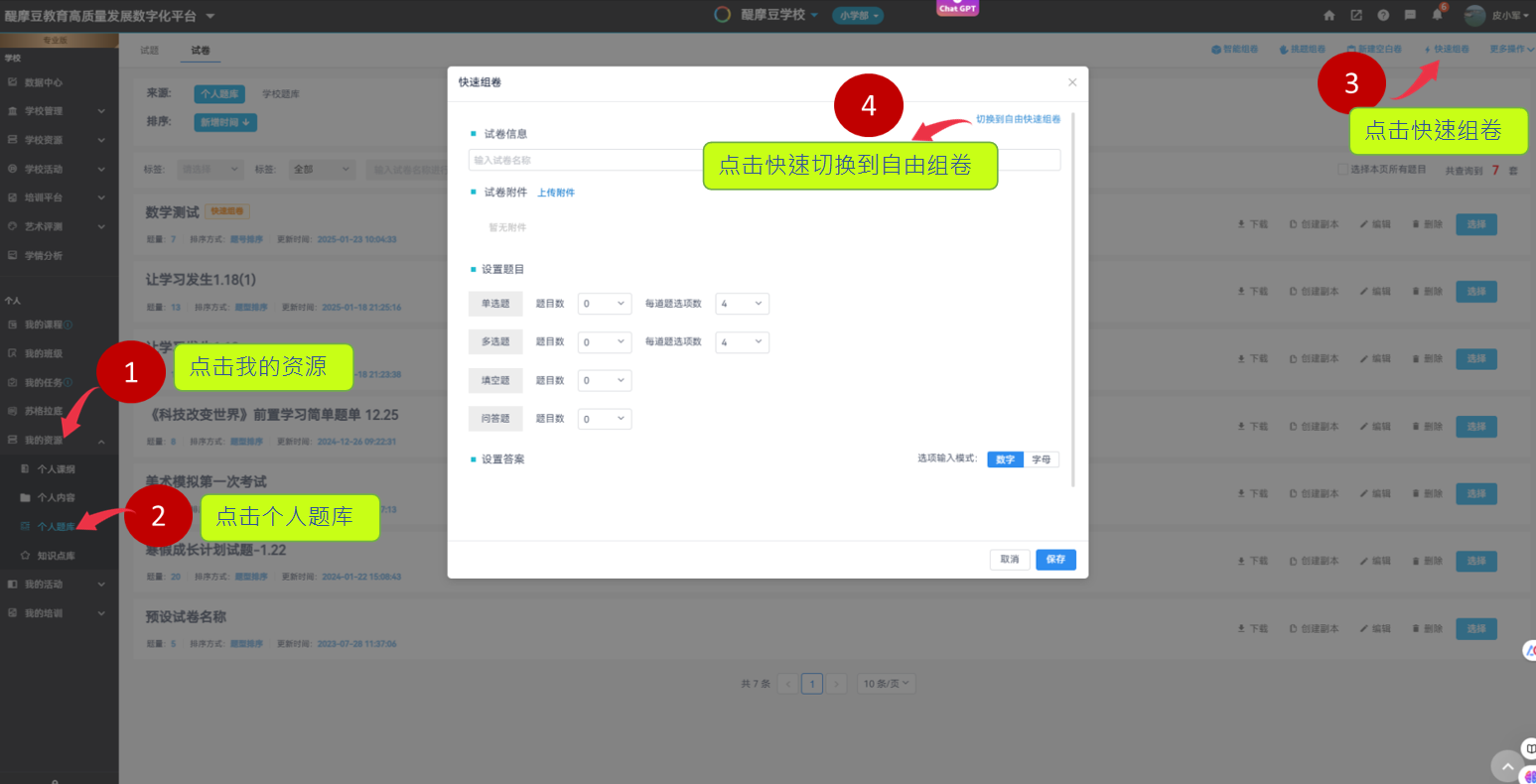 ?2.系統(tǒng)就會(huì)自動(dòng)開啟瀏覽器并自動(dòng)登入云端平臺(tái),依序點(diǎn)選「我的資源」、「個(gè)人題庫」,接著點(diǎn)選「快速組卷」,出現(xiàn)快速組卷視窗后,點(diǎn)選「切換到自由快速組卷」