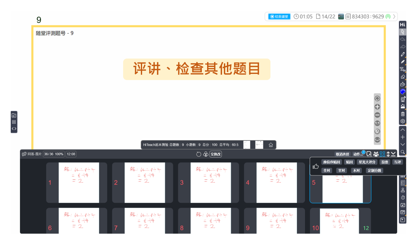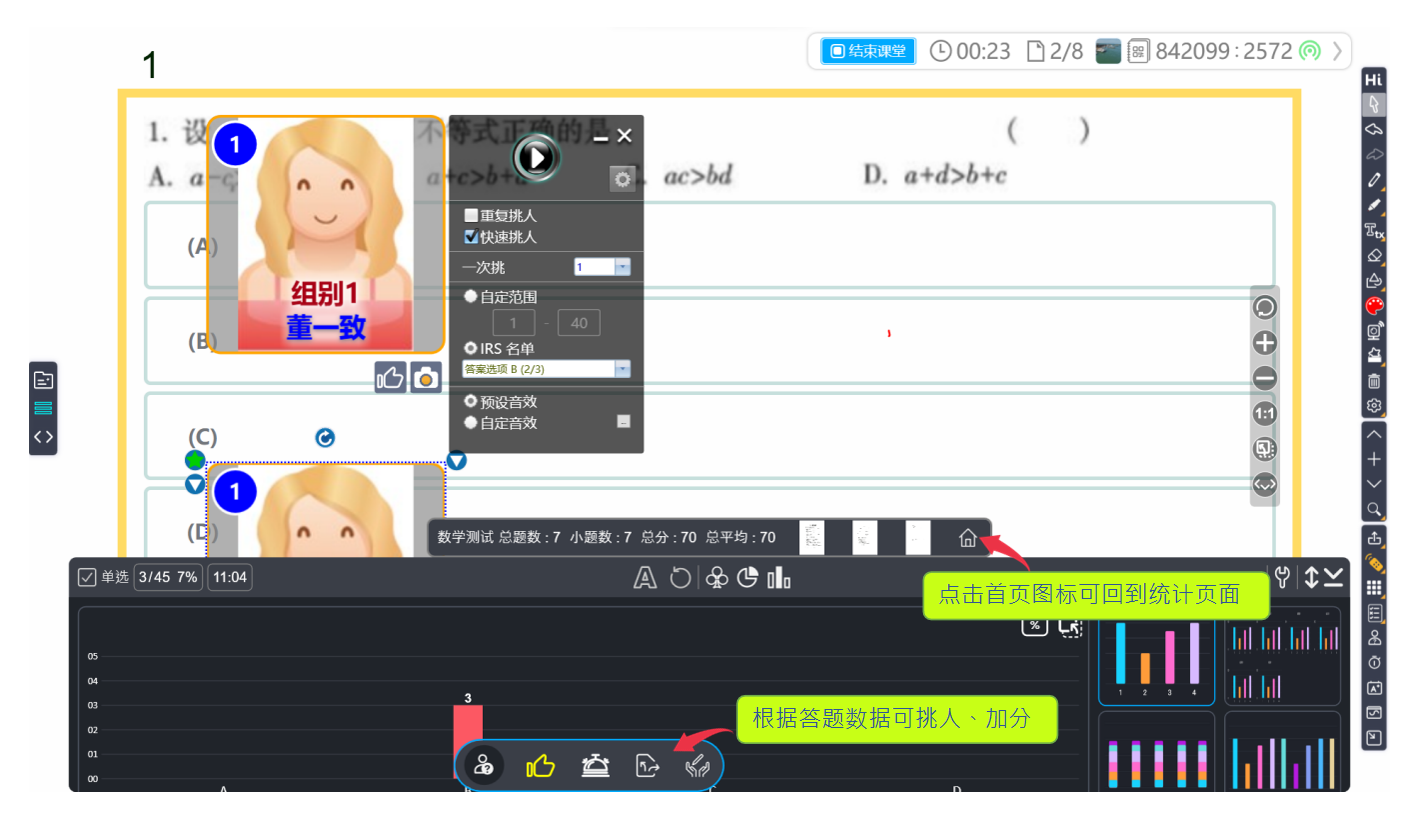 老師可根據(jù)答題選項(xiàng)進(jìn)行挑人、加分等互動(dòng)。點(diǎn)擊回首頁圖示,則會(huì)返回測驗(yàn)統(tǒng)計(jì)圖首頁,可再挑選其他題目進(jìn)行互動(dòng)評(píng)講。