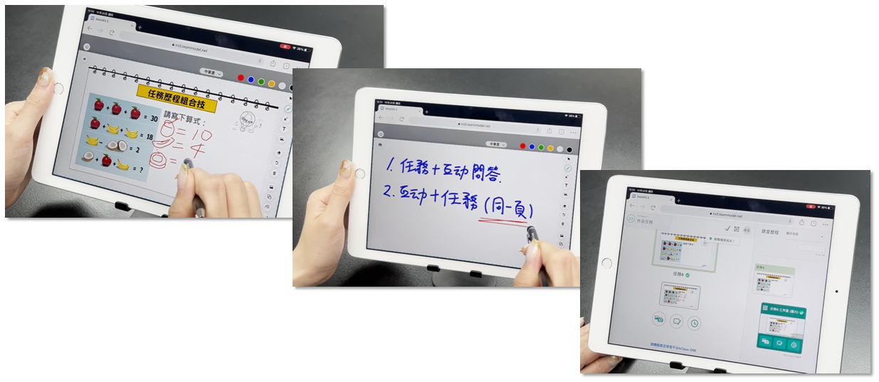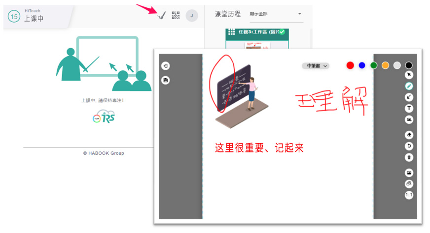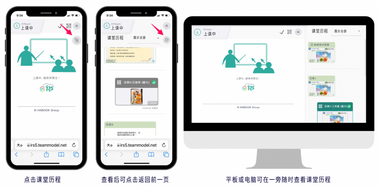 上課過(guò)程中,學(xué)生端可以隨時(shí)檢視課堂歷程,平板在右手邊就能夠隨時(shí)檢視,而手機(jī)受限屏幕大小,則是以選擇課堂歷程鈕的方式來(lái)切換檢視歷程。