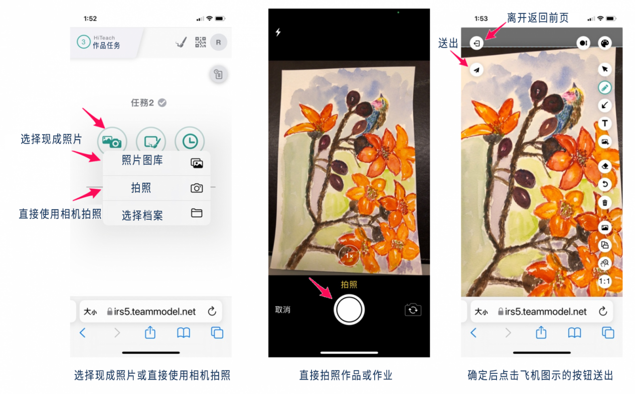 Web IRS接收到任務(wù)后,直接點(diǎn)擊相機(jī)圖標(biāo),選擇現(xiàn)成照片或直接使用相機(jī)拍照(平板、手機(jī)),確定后點(diǎn)擊飛機(jī)圖標(biāo)的送出鈕。
