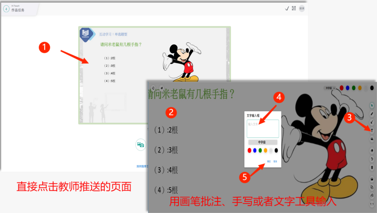 如果教師的任務(wù)是可以在其頁(yè)面進(jìn)行,則可以直接點(diǎn)擊教師推送的頁(yè)面圖,然后用畫(huà)板所提供的工具進(jìn)行畫(huà)筆批注、手寫(xiě)或者用文字工具輸入等實(shí)作,確定后點(diǎn)擊飛機(jī)圖標(biāo)的送出鈕,完成任務(wù)。