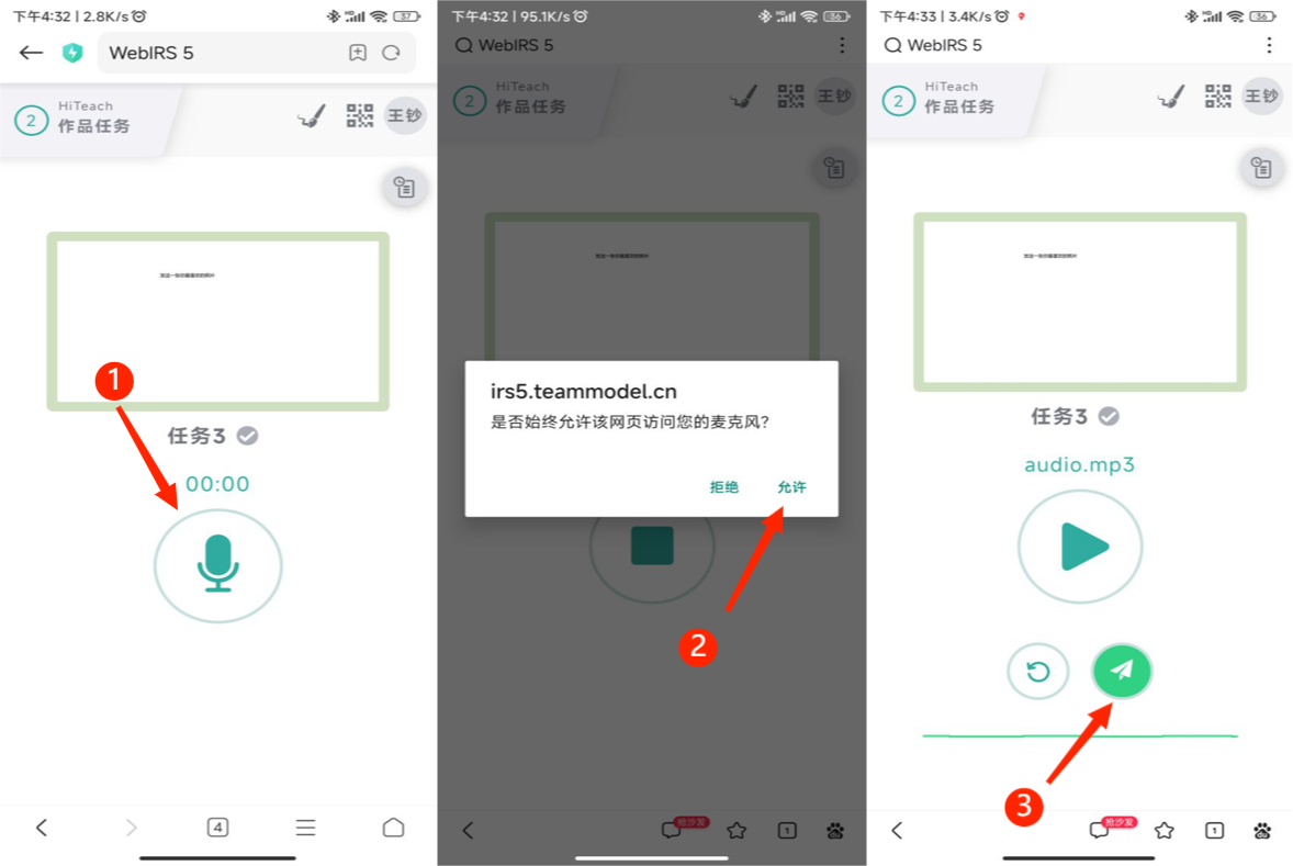 教師發(fā)布錄音任務(wù)后,學(xué)生用Web IRS即可使用平板(或手機(jī)、電腦)的錄音功能,按下錄音鈕后,通常會(huì)出現(xiàn)是否允許使用麥克風(fēng)的提示,請(qǐng)選擇允許,隨即可進(jìn)行聲音錄制,確定后,點(diǎn)擊飛機(jī)圖標(biāo)的送出鈕,完成任務(wù)。