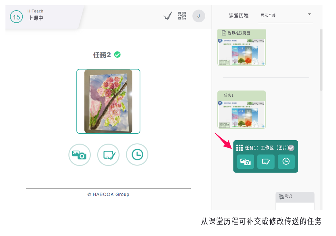如果某個(gè)任務(wù)需要比較長(zhǎng)的時(shí)間,或者學(xué)生比較晚參與,透過(guò)課堂歷程中,找出該任務(wù),只要該任務(wù)尚未結(jié)束,也可以補(bǔ)傳送任務(wù)。