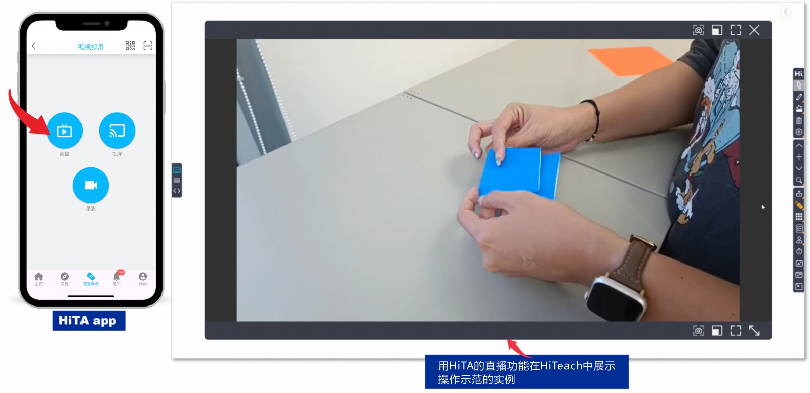 不必安裝投屏app,HiTeach結(jié)合HiTA app,就可以把手機(jī)上的各種教學(xué)資源,立即以無(wú)線方式投影到大屏或電子白板上,讓全班觀看與研討。是不是很方便呢!