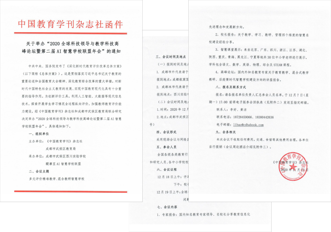 本次活動(dòng)由《中國教育學(xué)刊》雜志社、成都市武侯區(qū)教育局聯(lián)合主辦;四川省電化教育館、醍摩豆智慧教育研究院指導(dǎo);成都市武侯區(qū)西川實(shí)驗(yàn)學(xué)校、四川省楊光榮名校長鼎興工作室、醍摩豆AI智慧學(xué)校聯(lián)盟共同承辦。 3、活動(dòng)時(shí)間