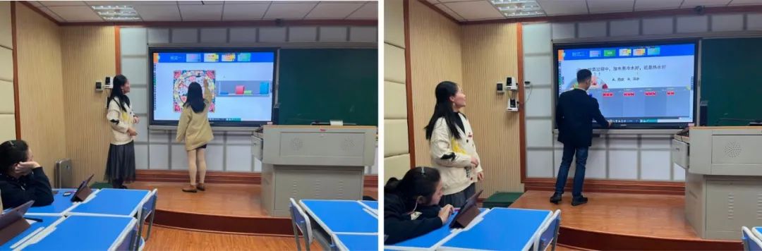許老師首先向大家介紹了智慧課堂的硬件、軟件設(shè)備,她詳細(xì)地說明了教師移動端界面和學(xué)生平板端界面的使用方法,讓大家對這些陌生的設(shè)備有了基礎(chǔ)的認(rèn)識。隨后,許老師以唱歌的呼吸為例進(jìn)行課堂實操演習(xí),她結(jié)合音樂課堂教學(xué)設(shè)置了各種各樣的操作任務(wù)幫助大家熟悉Hiteach3軟件的功能,大家積極參與其中,在逐步掌握功能操作的同時還感受到了音樂課帶來的愉悅。