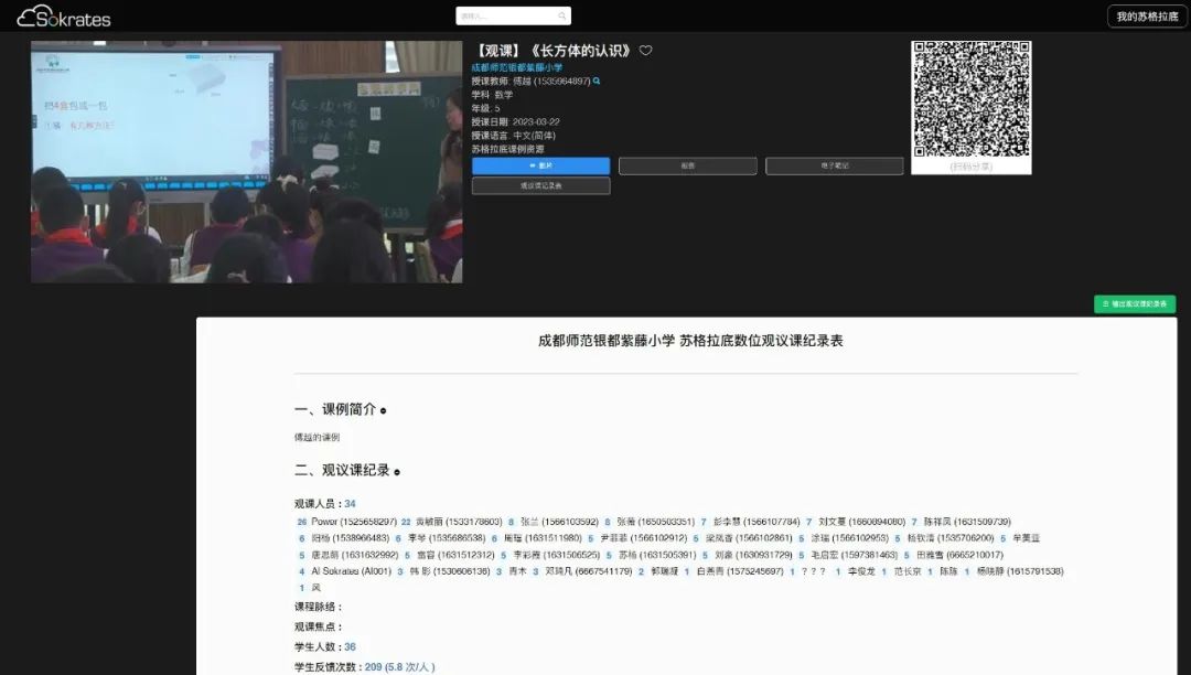 學術主持人馮蓮副主任開啟了→智慧教研環(huán)節(jié)。馮主任詳細解讀了本節(jié)課教與學蘇格拉底數位觀議課記錄表、線上實時評課標簽、智慧聽課本,展示了評課內容如何實現開放、精準、共享。紫藤小學數學團隊結合課堂數據,從學生行為、老師行為、老師提問和教學設計等方面,圍繞課堂教學難點和熱點問題進行了深入探討,讓在場來賓贊不絕口。