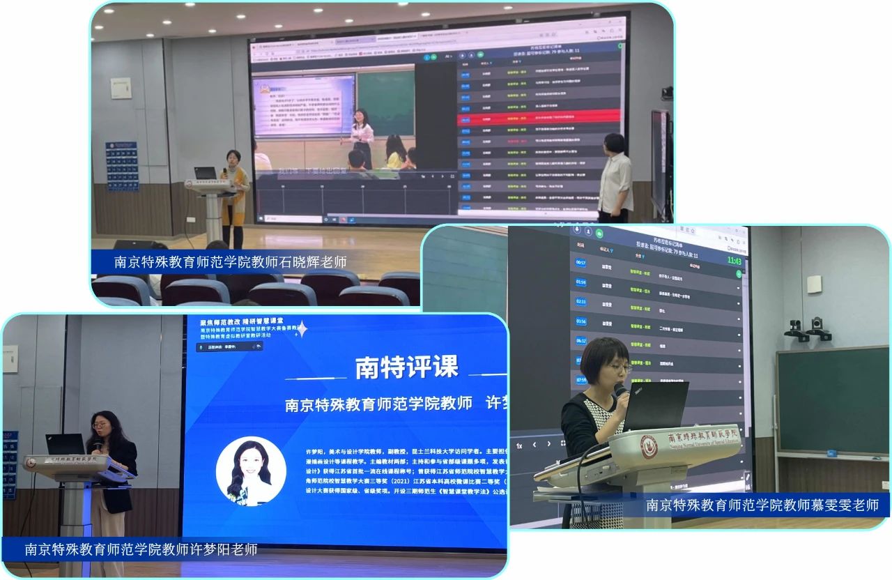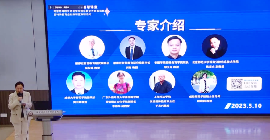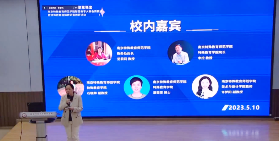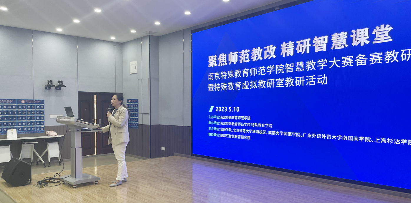 5月10日,由南京特殊教育師范學院主辦的“聚焦師范教改,精研智慧課堂——南京特殊教育師范學院智慧教學大賽備賽教研暨特殊教育虛擬教研室教研活動”在學校博遠樓106-AI遠程智慧教研中心舉行。本次活動包含智慧大學展示課、教師微報告、專題報告、五地線上線下智慧教研、師范類高校評課研討等環(huán)節(jié),參與本次活動的專家有:南京特殊教育師范學院教務(wù)處處長范莉莉教授、南京特殊教育師范學院特殊教育學院院長李拉教授、貴州省安順學院特殊教育學院院長邱天龍教授,北京師范大學珠海校區(qū)陳星火副教授,上海杉達學院漢語國際教育系主任于東興教授,咸陽師范學院碩士生導(dǎo)師趙婉莉教授、成都大學師范學院副院長黃云峰教授、廣東外語外貿(mào)大學南國商學院英語語言文化學院副院長李春梅副教授、醍摩豆智慧教育研究院院長吳權(quán)威教授、劉彬教授等。