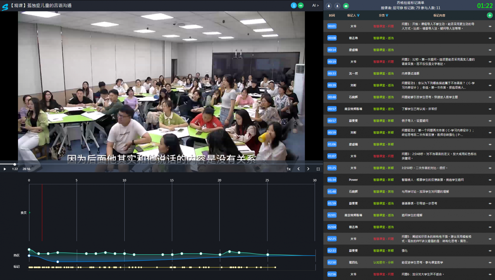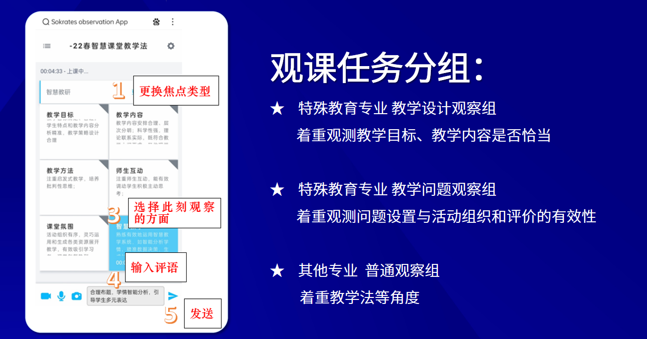本次活動以“智慧教研”為中心,主持人帶領(lǐng)大家一起觀摩南京特殊教育師范學院屈可錚老師的智慧課例《孤獨癥兒童社會性發(fā)展與教育》,線上線下觀摩專家、老師通過掃碼進行同步打點標記。在蘇格拉底議課APP上,可以更換焦點類型,選擇點評方向,將教學過程中的重難點、建議點、教學設(shè)計新穎點通過文字、拍照等方式進行記錄。 課例展示結(jié)束后,南京特殊教育師范學院教師石曉輝老師從教學設(shè)計中的教學目標、教學內(nèi)容是否恰當,慕雯雯老師從問題設(shè)置與活動組織和評價的有效性出發(fā)進行點評,兩位老師對本節(jié)課教學設(shè)計、教師行為給予認可和肯定。許夢陽老師從教學法的角度進行觀摩評課,表示本節(jié)課的技術(shù)運用讓課堂教學更完美,師生互動更高效。 隨后,醍摩豆智慧教育研究院劉彬教授主持教研評課與研討環(huán)節(jié),打開蘇格拉底平臺,蘇格拉底標記清單展示了所有評課記錄,眾籌集體智慧,打造青年教師研修學習的優(yōu)質(zhì)教研資源庫,智慧的結(jié)晶薪火相傳! 安順學院特殊教育學院院長邱天龍教授,北京師范大學珠海校區(qū)陳星火教授,上海杉達學院漢語國際教育系主任于東興教授對本節(jié)課進行專業(yè)點評。邱天龍教授基于特教專業(yè)進行總結(jié)提煉,他表示本節(jié)課教學內(nèi)容從自閉癥兒童影響到干預(yù),整堂課邏輯清晰,聯(lián)系緊密,層次感強,智慧教室的使用讓學生獲取知識快捷,回復(fù)家長來信板塊設(shè)計新穎。