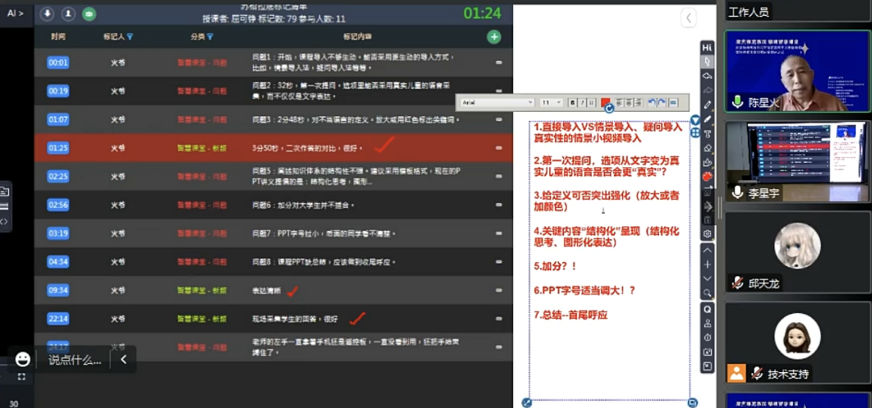 陳星火教授從“新穎”“建議”出發(fā)對課例進行專業(yè)點評,他表示本堂課利用信息化手段,二次作答技術(shù)的使用讓課堂教學效果突出,通過錄音采集學生的回答設(shè)計也很新穎,給人眼前一亮的感覺。并在課程導(dǎo)入、知識體系闡述、教學課件設(shè)計方面提出中肯建議。